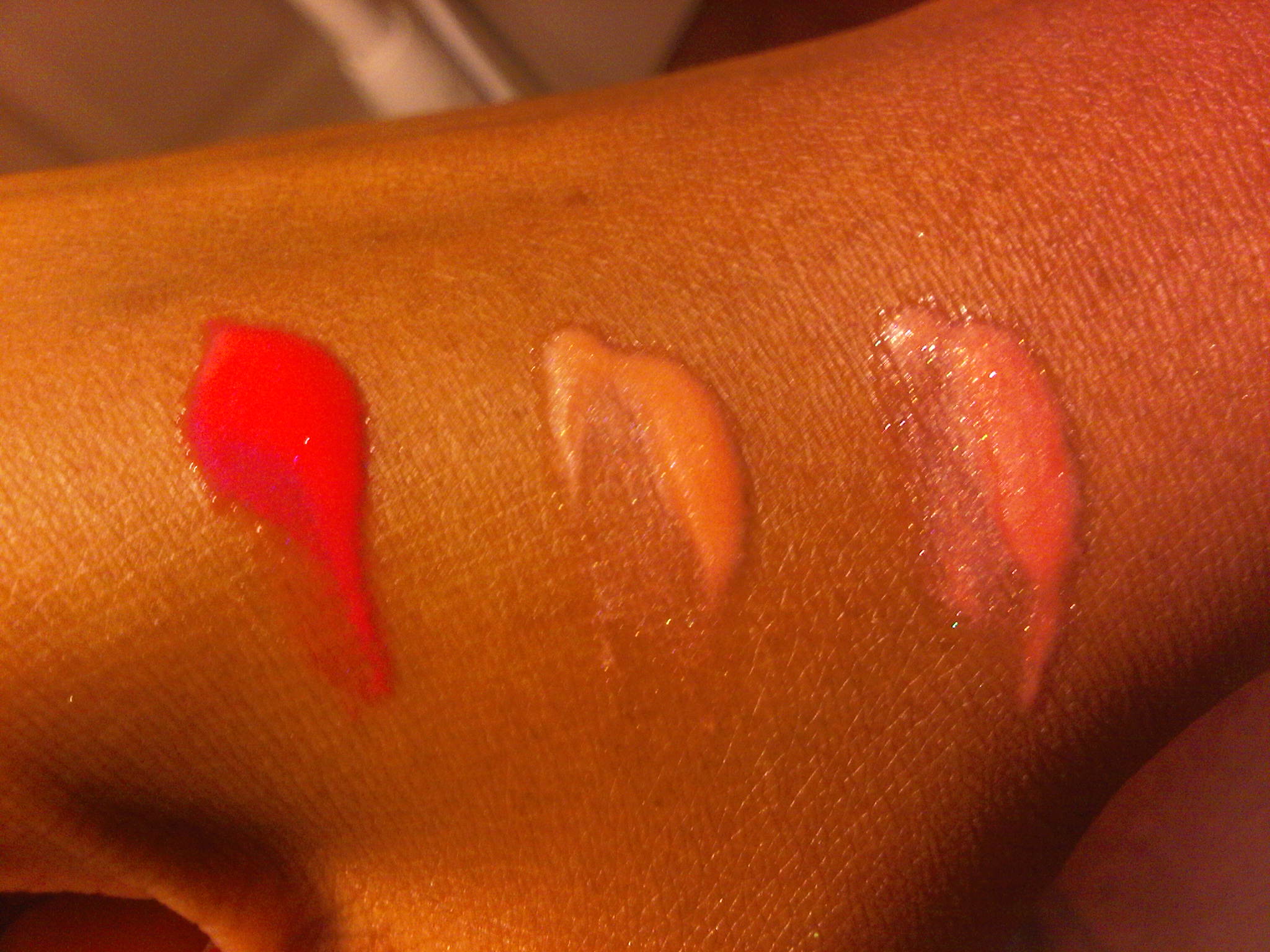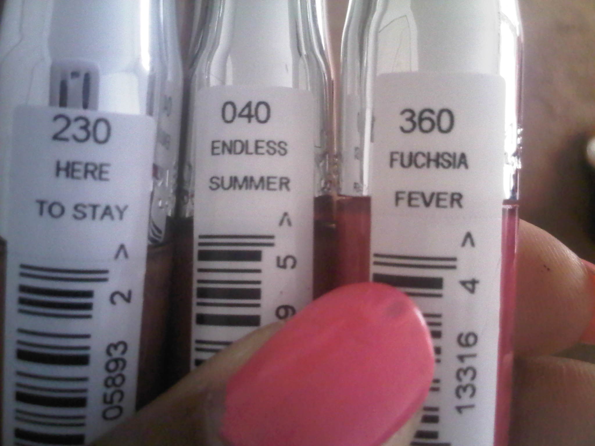 I believe these glosses were somewhere around $ 3.50 each at Walmart. I had never seen this particular product from Rimmel before so I wanted to give them a try. Fuchsia Fever, as the name implies is a bright patent pink gloss. Here To Stay is more of a taupe colored gloss with slight shimmer. Endless Summer is a pinky nude gloss with heavier shimmer than Here To Stay. All three colors are definitely perfect shades for summer. I must say, however, I do have mixed feelings about this product.
