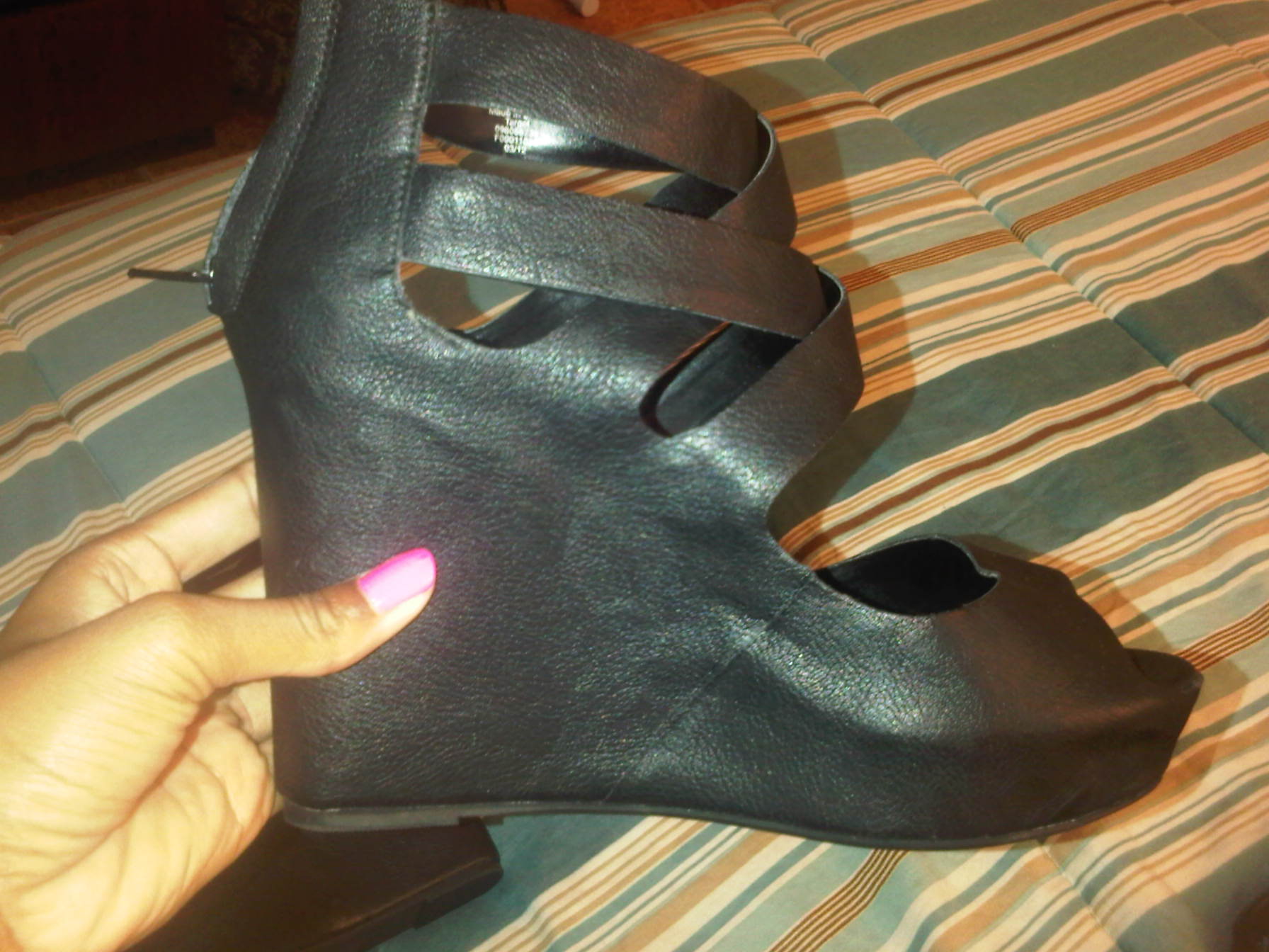 Description: Gladiator type wedge with open toes and criss-cross straps; fully covered heel with zip-up closure in the back; cushioned insole; made of faux leather;