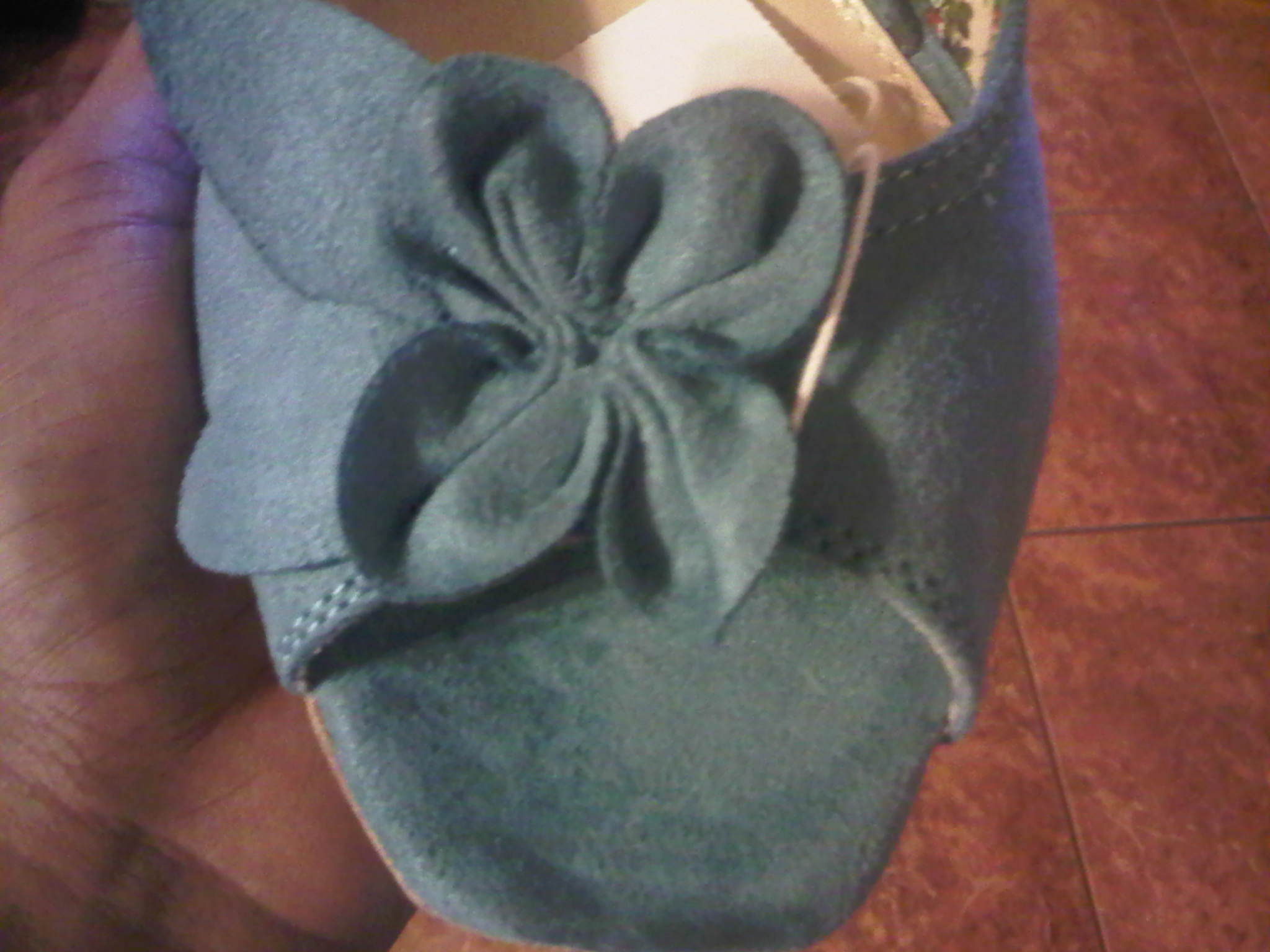Description: peep toe cork-print wedge; slip-in style; lightly padded insole; front flower detail; made of faux suede.