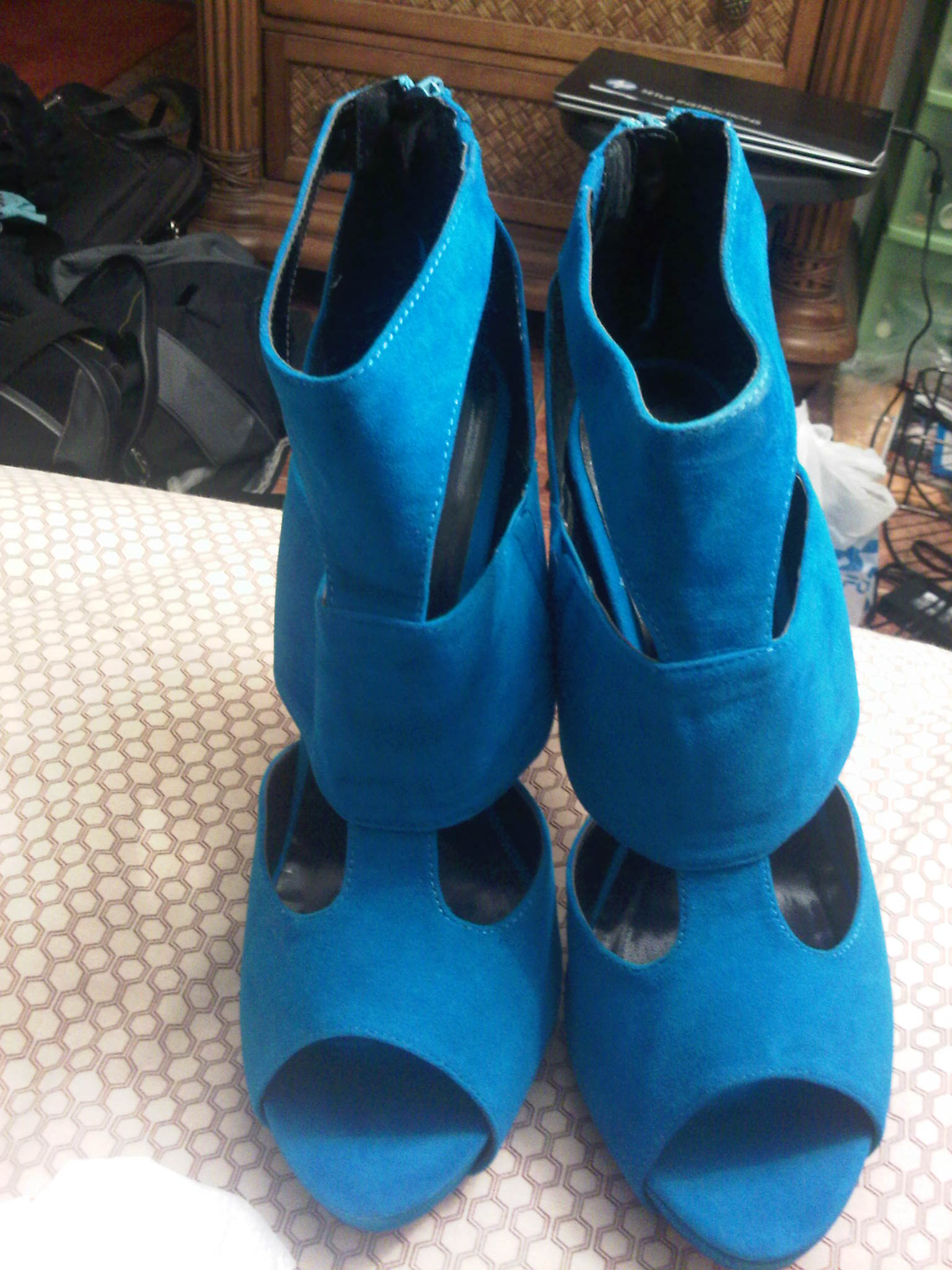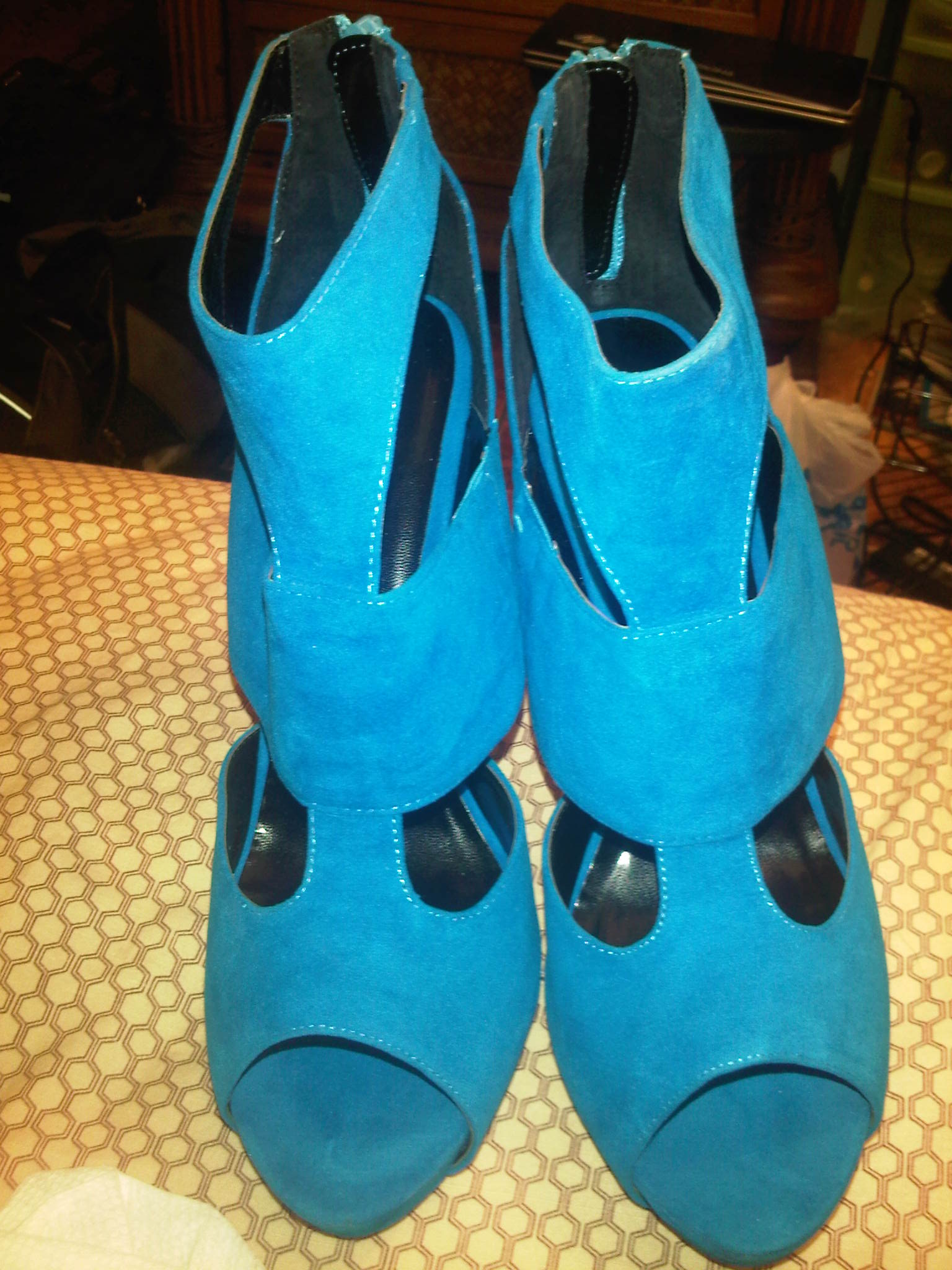 Description: 3/4 platform, 5” heel; entire shoe, including platform and heel covered with bright blue suede fabric; peep toe; t-strap with extra middle strap [almost gladiator like, but dressy]; back zip closure