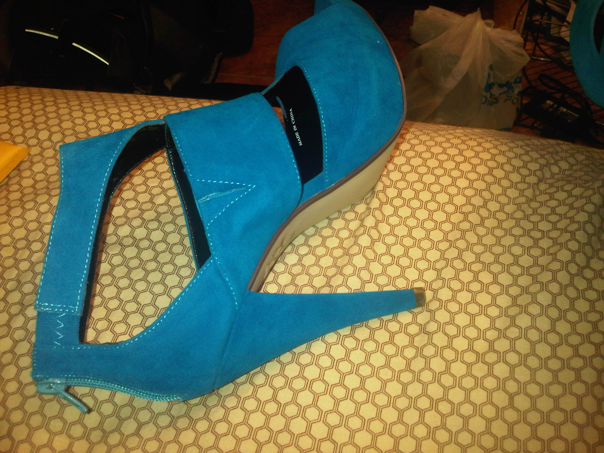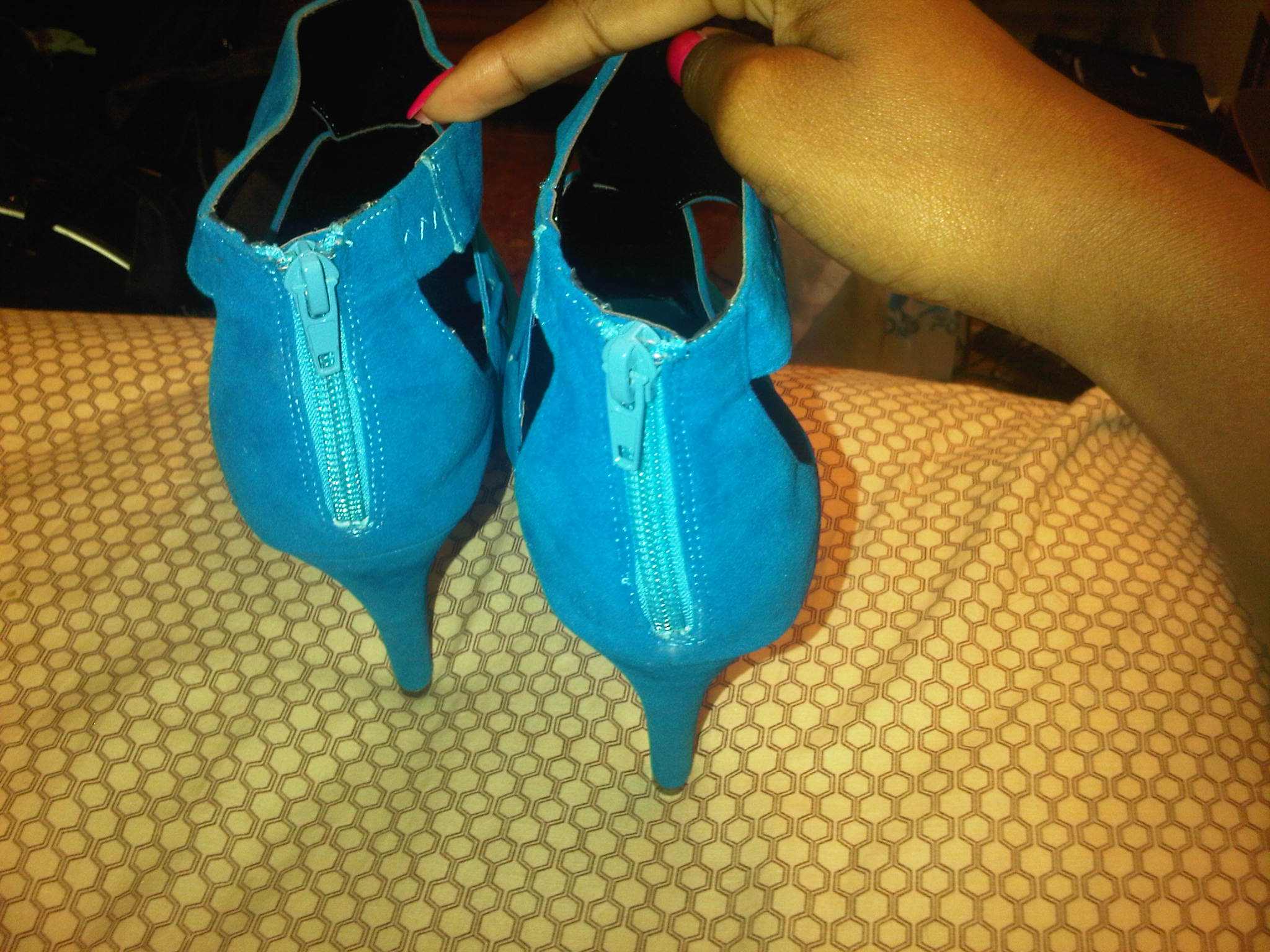 Soo guyss! Im drooling!! Im grinning even just glimpsing over at them!! 😀 ……I’m in ‘shoelove’ right now. But before I even get into it, let me tell you guys how this started. I was out with my girlfriend who was visiting me from the Bahamas, and I went to get a repair on my recent gel manicure. While I was waiting to get that done, she went to go browse in a store next door to the nail shop. After about 30 min she came back with a bag of cute accordian striped ballerina flats, a pink camisole and a beautiful sheer button front blouse. Needless to say, I made a beeline over there as soon as my nails were done! And can I tell you guys…..MMMERCYI I found a few items that I loved [and bought….haul to follow :)], but while I was skimming the aisles, my gf beckoned to me that they had shoes IN MY SIZE !!!!! AHHHHH!!!!!! I was thinking to myself that this was too good to be true, but I walked in that direction anyway. I got over there, and sure enough they were shoes available in that size. I looked around a bit and was kinda lukewarm about most of them [they were cute but not cute enough for me to pay that much since it wasn’t love at first sight]. However, while looking at the mediocre section of wedges and flats, I saw out of the corner of my eye the most beautiful blue ever! I gasped and dashed over. Then I went through my mental steps: