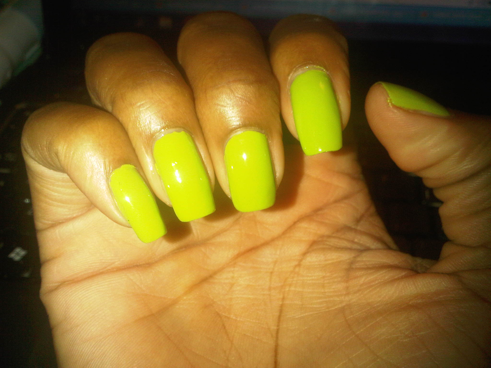Description: Guys……AHHHH!!!!! This is like Kermit the Frog green! I have never had my nails in a color anywhere near this before and i just cant stop looking at them. I love them. Of course, the klutz that is me has already managed to smudge 2 of them [thankfully not too badly] but I still think they’re great! I think the pictures with the flash are more accurate representations of the true color of this polish. Hope you guys like 🙂