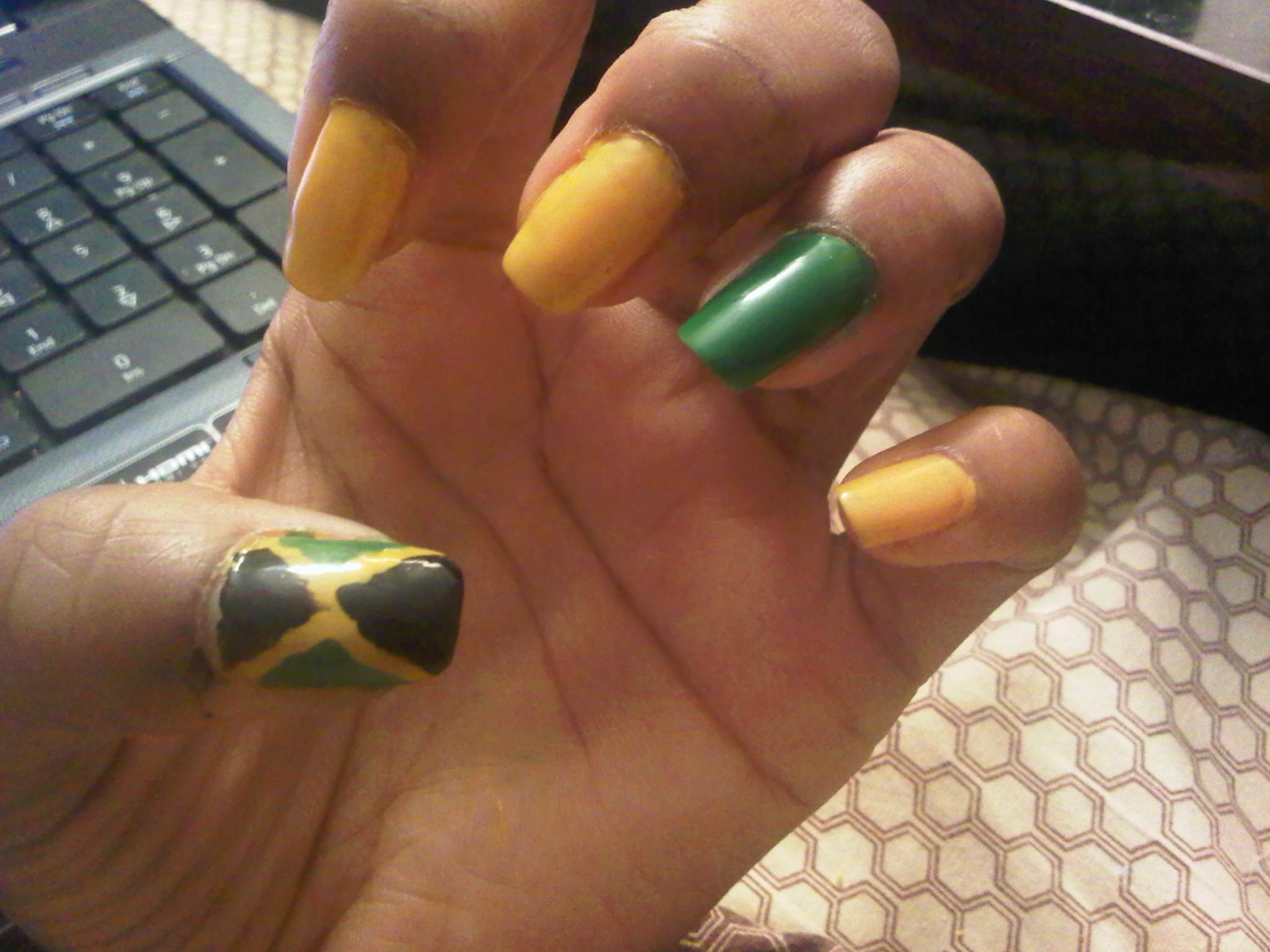 For those of you who aren’t too familiar with me yet, or haven’t read my About Me section, I am Jamaican, not just by descent but by being raised there as well [bawn an’ rear fa mi yaad people dem]. So, with that in mind, I am also one of the proud Jamaicans celebrating Jamaica50 on August 6 with all my fellowmen [2012 is the 50th year since Jamaica gained its independence]. Emancipation Day for our country was August 1 as well, so as you can tell, we are having quite a big week here :). In honor of my amazing country, I decided to do a ‘nail tribute’, so to speak, featuring the colors of my flag, as well as the flag itself.