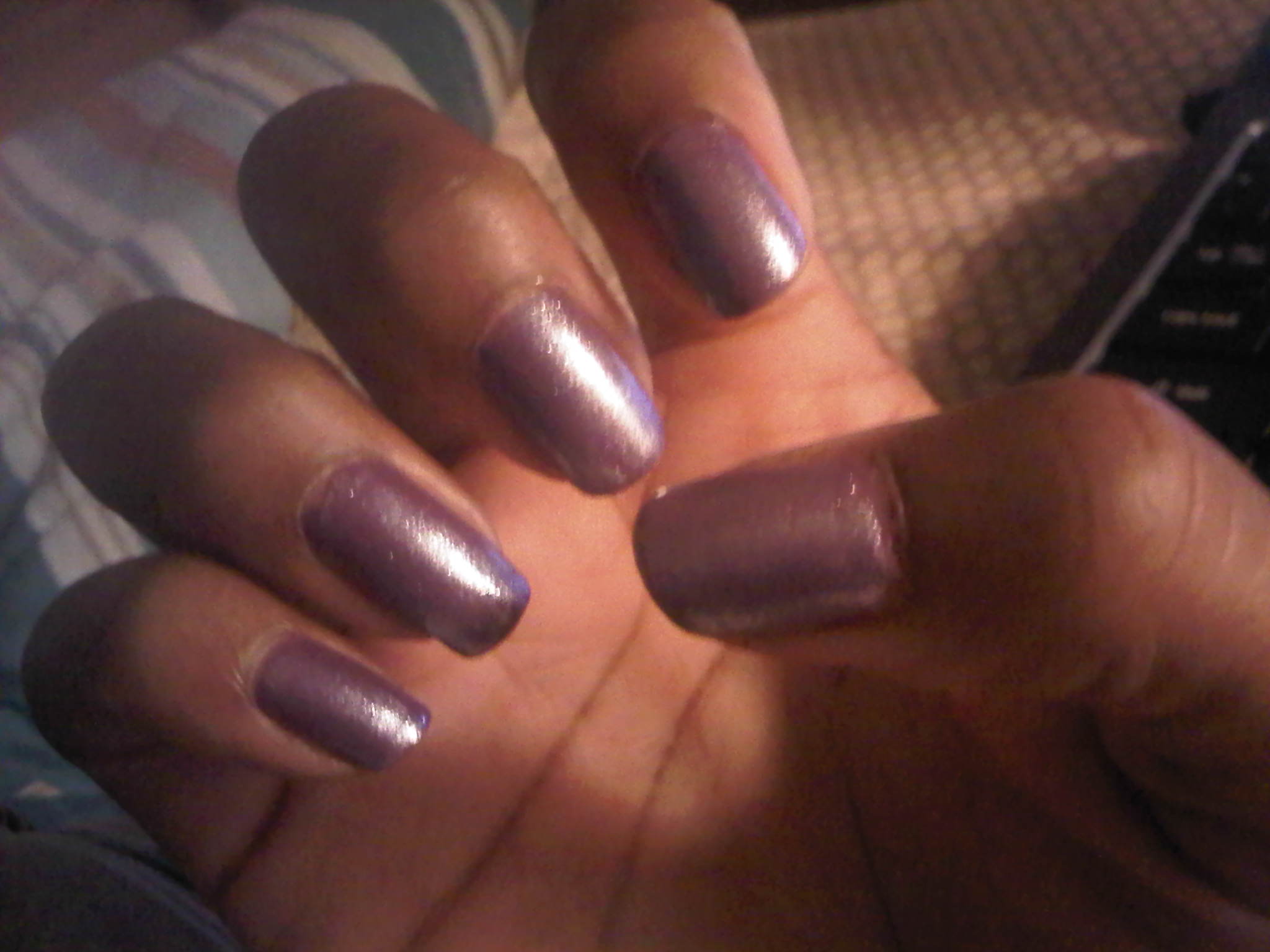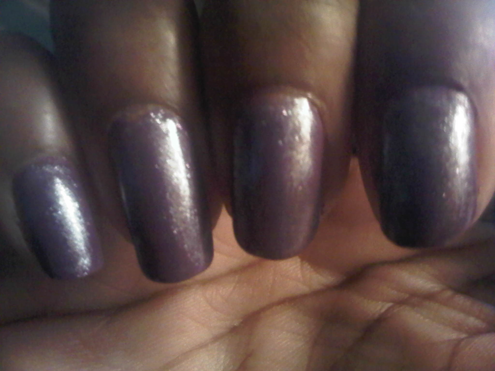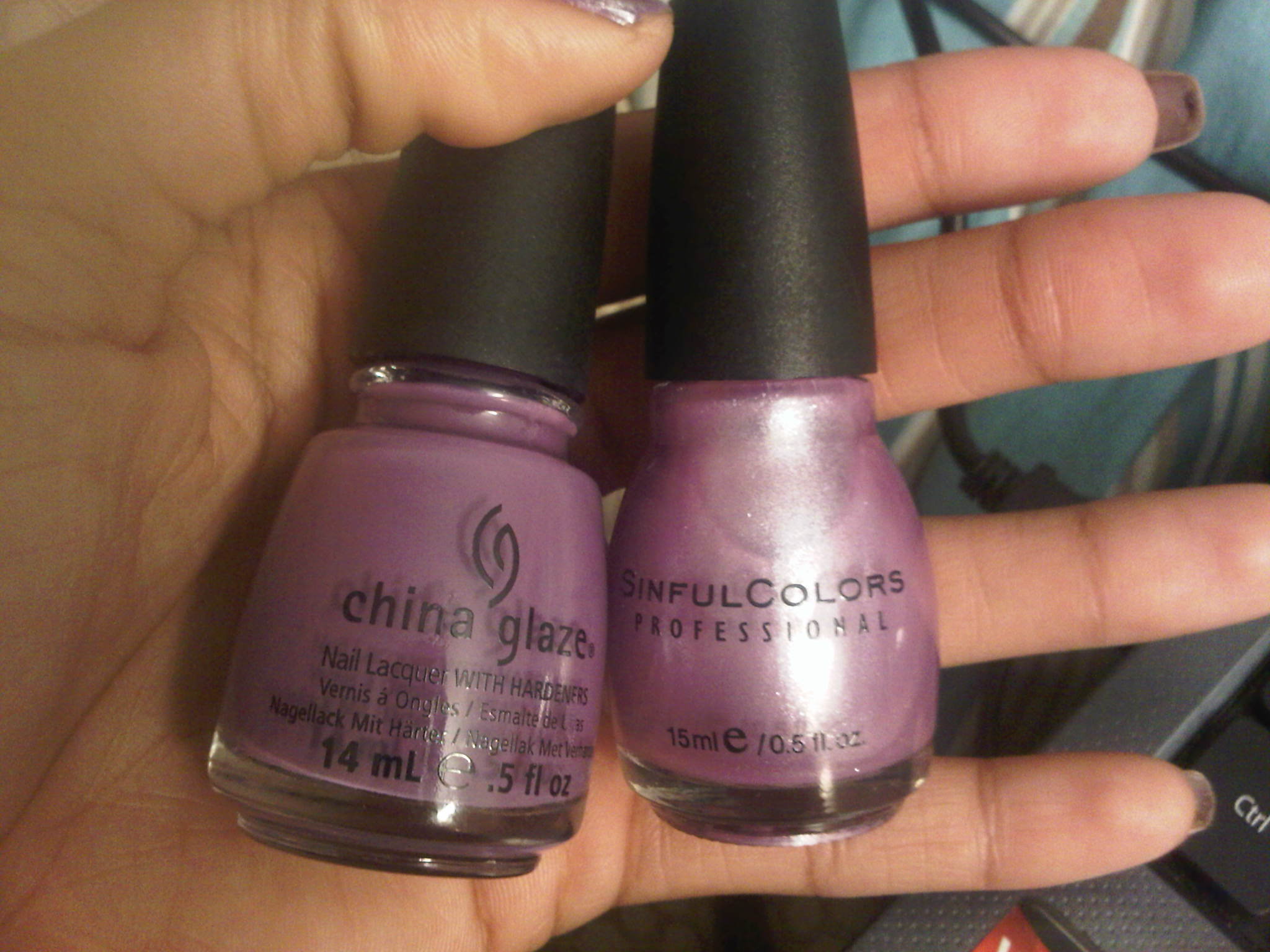 Featured this week are my two wonderful brands: ‘Sinful Colors’ and ‘China Glaze’. First off, I must say the quality of these polishes were on point from the start. I did two coats of the China Glaze for intensity and richness, but one coat would be just fine as well, since the color wasn’t streaky or watery. The ‘China Glaze’ polish is a creamy medium purple, and on its own it really makes a statement. The ‘Sinful Colors’ polish is a beautiful purple shimmer frost [and it must have really caught my eye people, for I am not a fan of frost polishes].