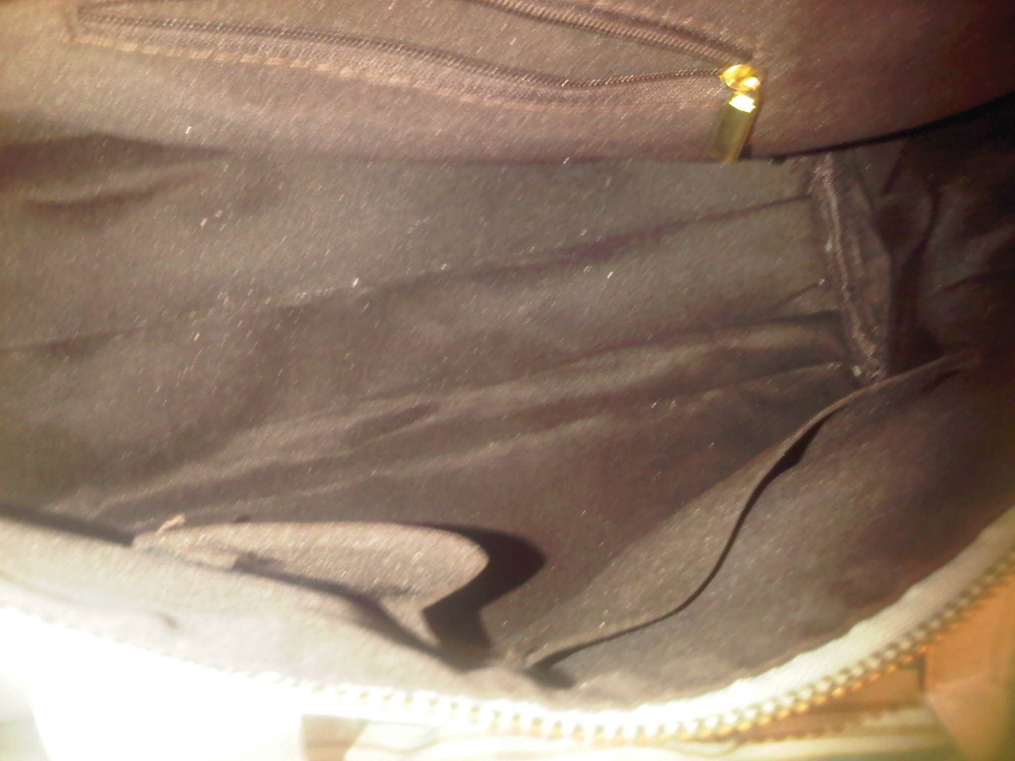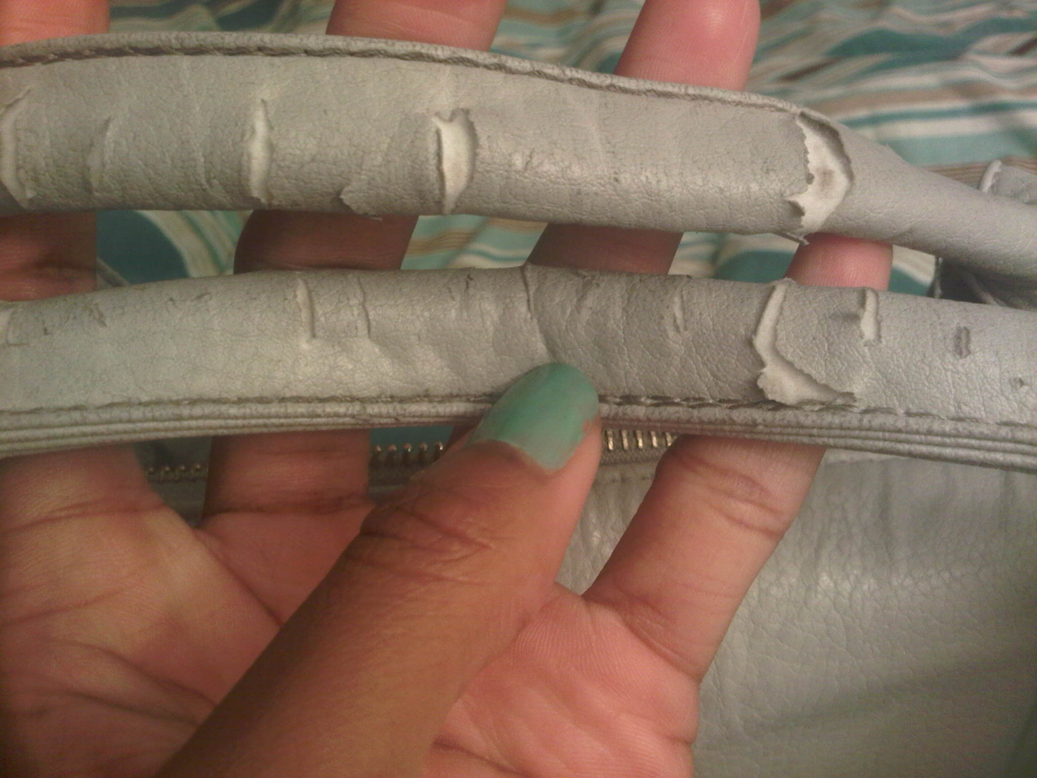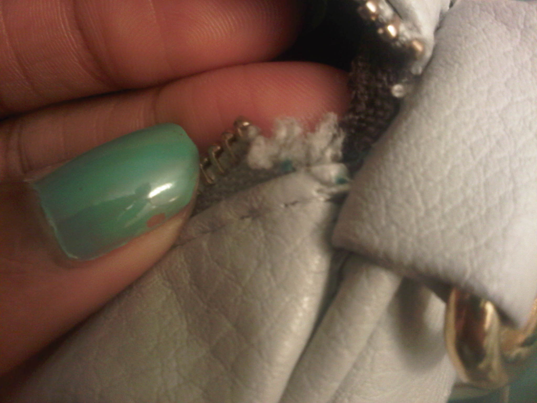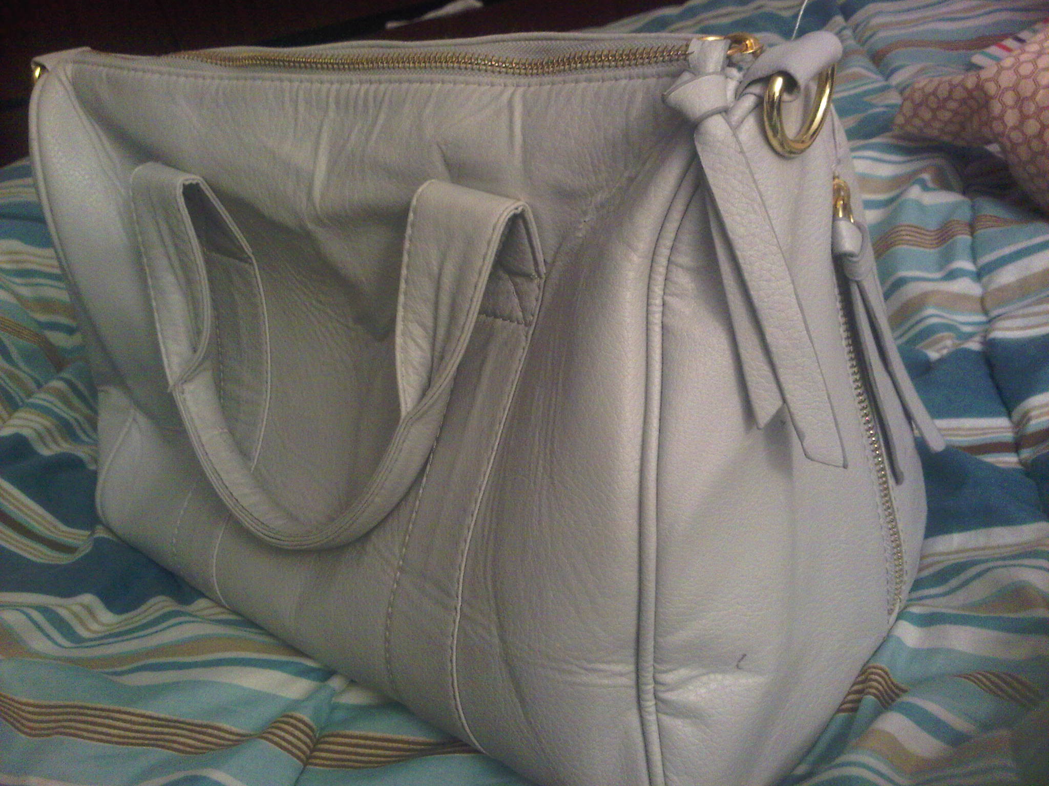 My latest purchase consisted of two bags. One was a light grey, studded bottom, faux leather duffel tote bag. It was big cute and functional. It has 2 hand straps, but also comes with a shoulder strap. Each side of the bag has 2 vertical zips, and the brown interior has a zipper pocket as well as 2 other open pockets. As soon as I got this bag, I put it to good use, switching all my personal items over to it, and making it my everyday handbag. Even though I did love the look of this bag [and I still do], i have an issue….for the first time since I started ordering from EBAY, have I purchased a bag that was not high quality. I am disappointed. The faux leather didnt seem soft or supple, it felt somewhat cheap. The bag began to quickly crack, especially at the handles, and has even started to look a bit dingy. The main zipper even began to tear and fray. I have never had this problem before, and I have only had the bad for about 3 weeks. It cost me about $ 23.00 including shipping, which doesn’t break the bank, but at the same time bothers me because I really did like it. Here are some pictures of the bag, as well as a few shots of the damaged areas:
