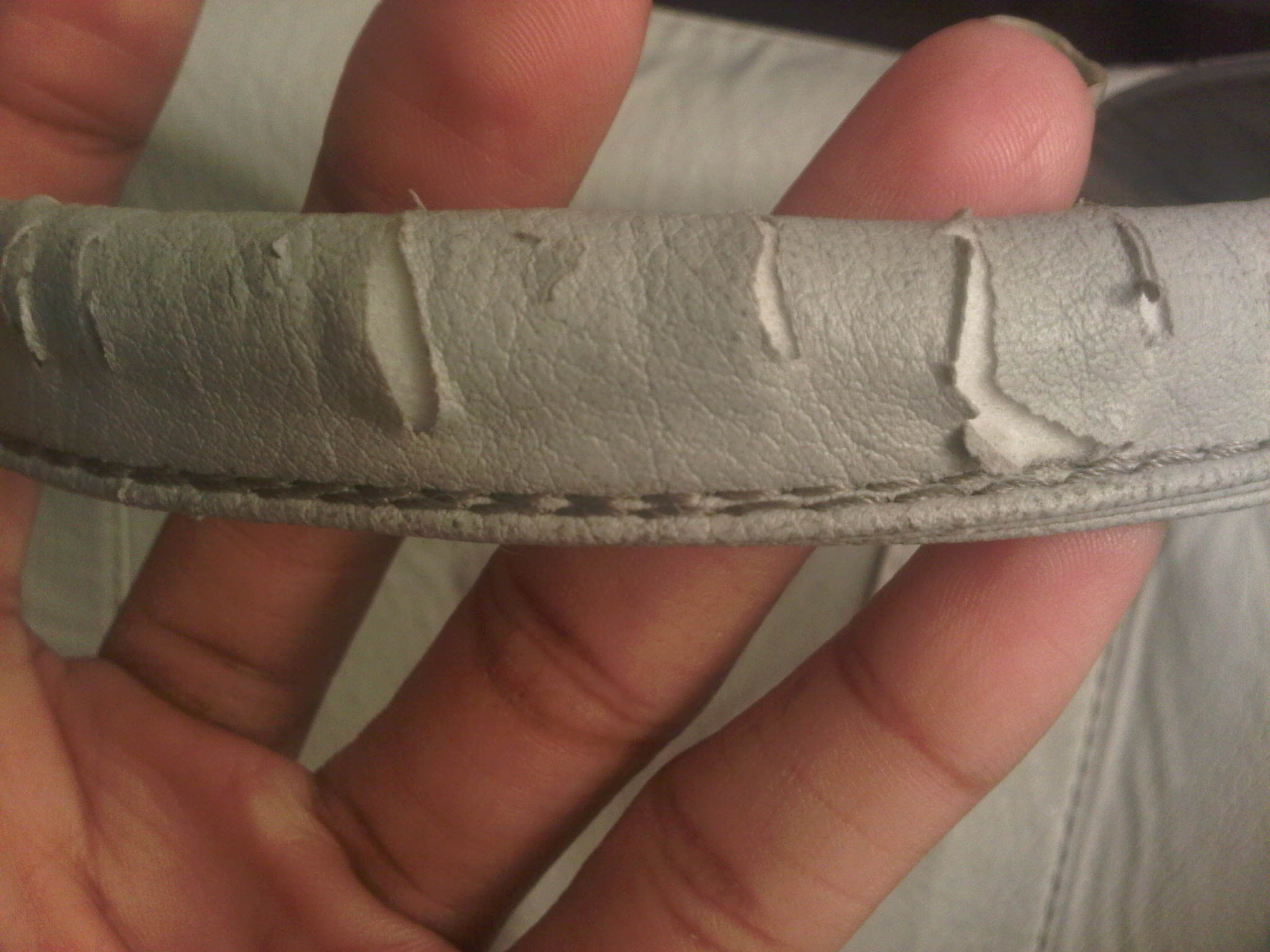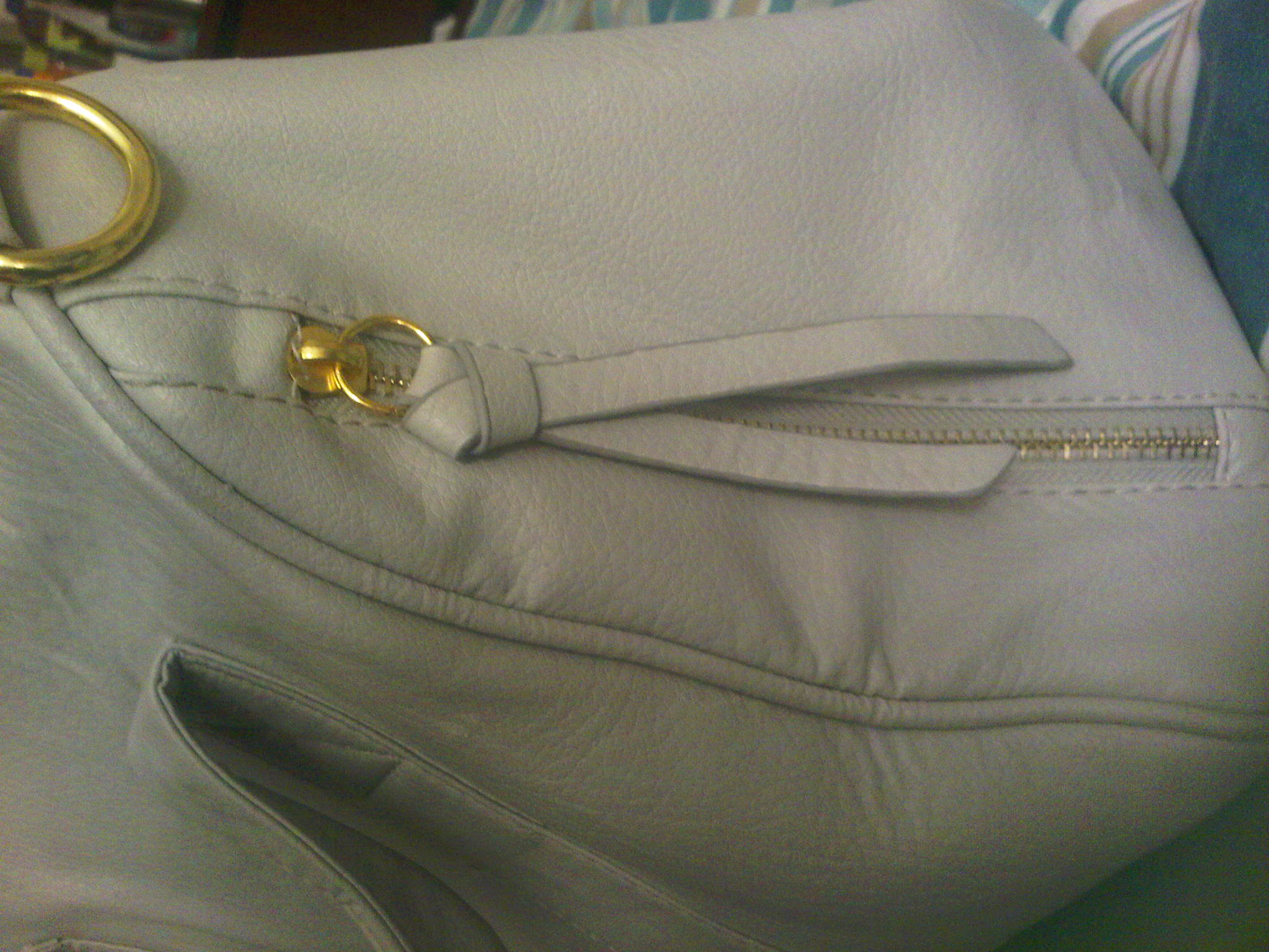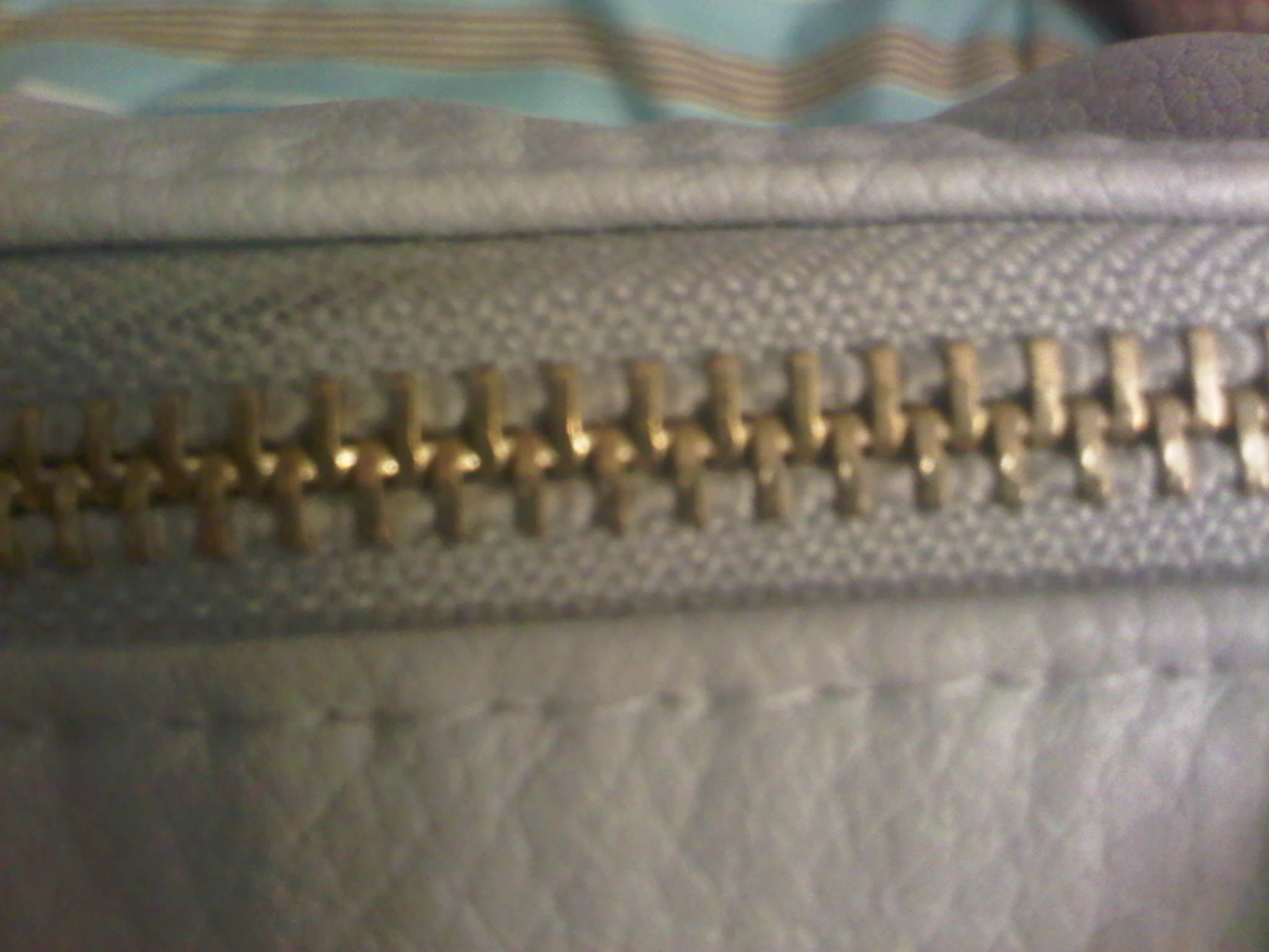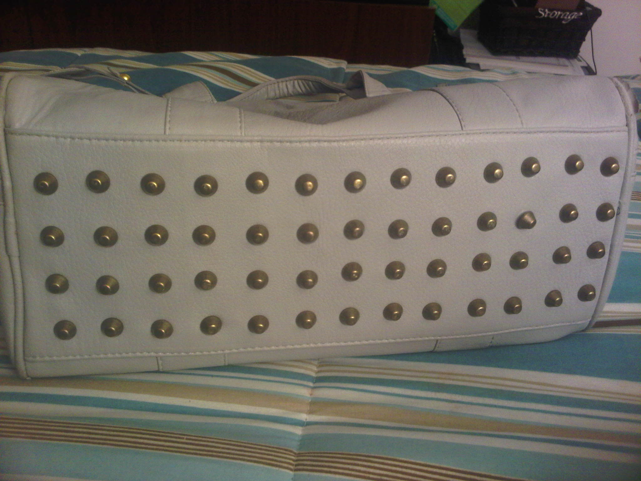 My latest purchase consisted of two bags. One was a light grey, studded bottom, faux leather duffel tote bag. It was big cute and functional. It has 2 hand straps, but also comes with a shoulder strap. Each side of the bag has 2 vertical zips, and the brown interior has a zipper pocket as well as 2 other open pockets. As soon as I got this bag, I put it to good use, switching all my personal items over to it, and making it my everyday handbag. Even though I did love the look of this bag [and I still do], i have an issue….for the first time since I started ordering from EBAY, have I purchased a bag that was not high quality. I am disappointed. The faux leather didnt seem soft or supple, it felt somewhat cheap. The bag began to quickly crack, especially at the handles, and has even started to look a bit dingy. The main zipper even began to tear and fray. I have never had this problem before, and I have only had the bad for about 3 weeks. It cost me about $ 23.00 including shipping, which doesn’t break the bank, but at the same time bothers me because I really did like it. Here are some pictures of the bag, as well as a few shots of the damaged areas: