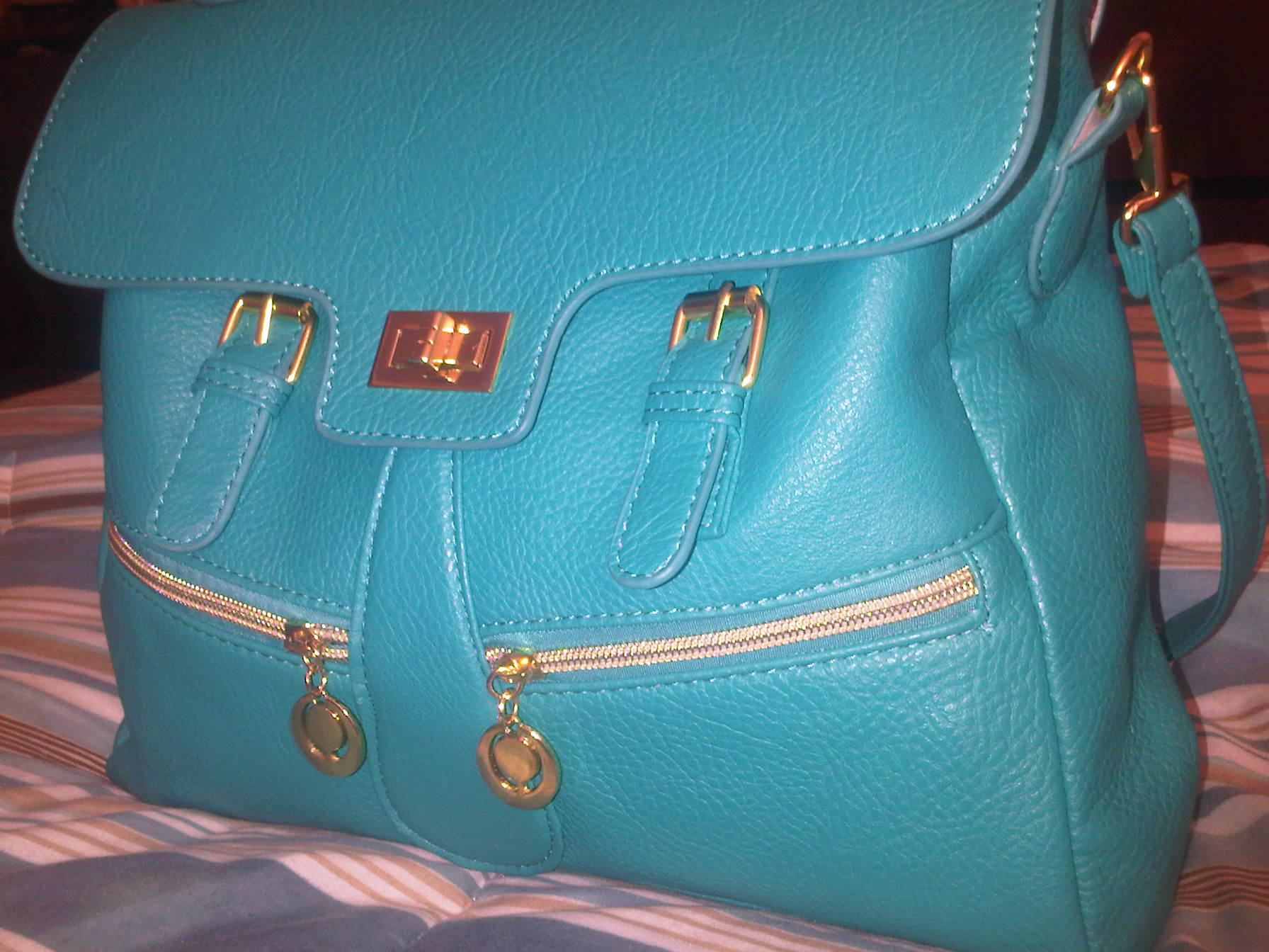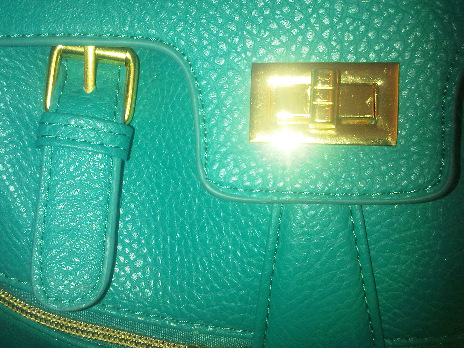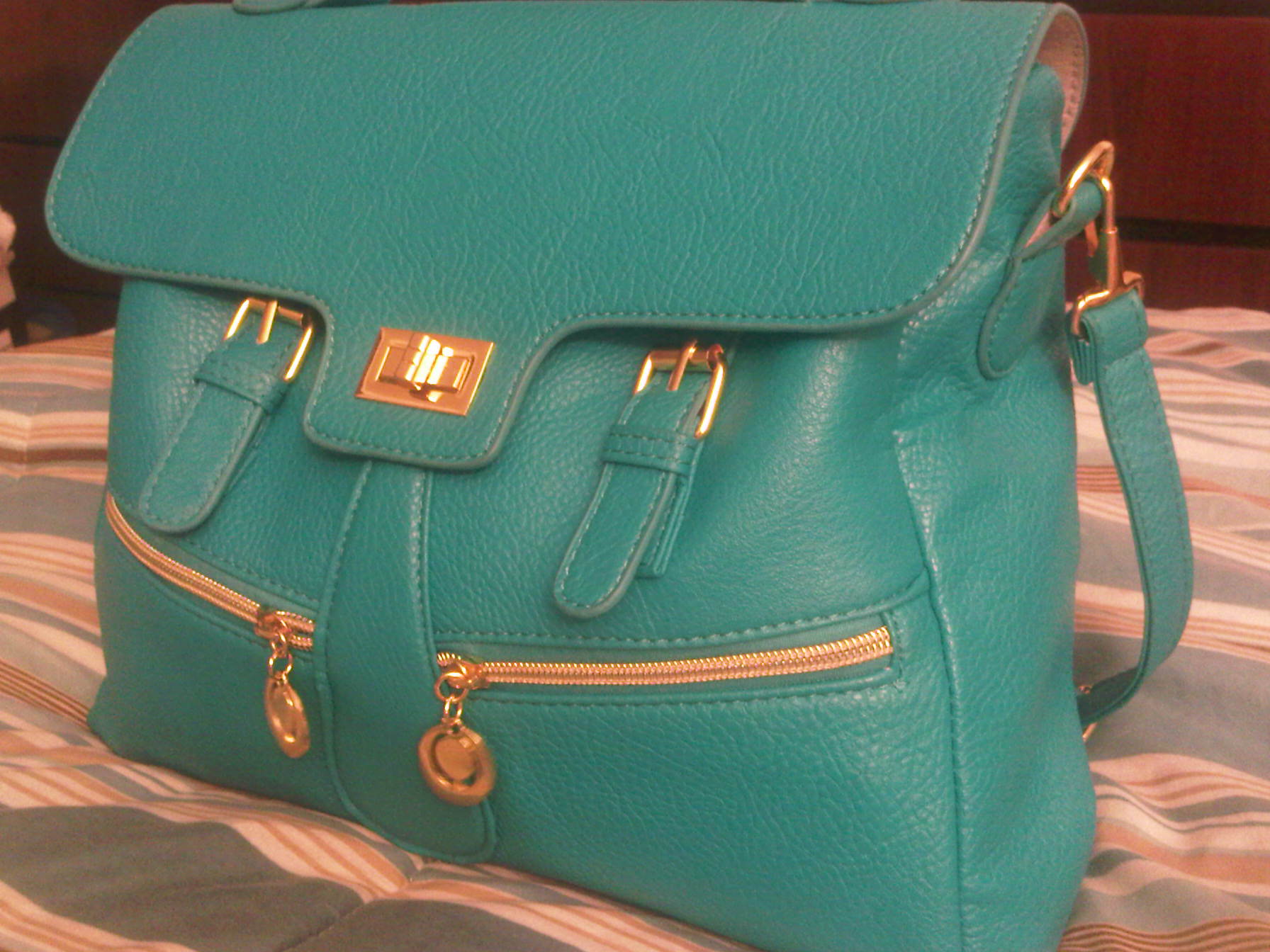 The second purse I purchased…….AAAHHHHHHH!!!!!! Its so pretty!! The color got me while I was scrolling down all the options to buy. Its the perfect pop of color to liven up any outfit! Its like one of the richest teals you have ever seen. Its a satchel type bag, with buckle detail and gold hardware. It features a single handstrap on top and a twist-to-close closure [in addition to a concealed zipper underneath for added privacy and security. It also has two front slanted zipper compartments for added flare. The interior also has a zipper compartment, and this bag does come with a shoulder strap should you choose to wear it that way. I am MUCH more pleased with this purchase. It may be smaller than the other one, which is not usually my preference for an everyday bag, but it still holds a great deal. I also am quite happy with the fact that the purse has a zipper making my items even more secure. The texture and quality of the bag is much better, and did I mention the COLOR??!! Mercy! This purse cost me $ 25.00 including shipping and so far, it is worth every penny!!