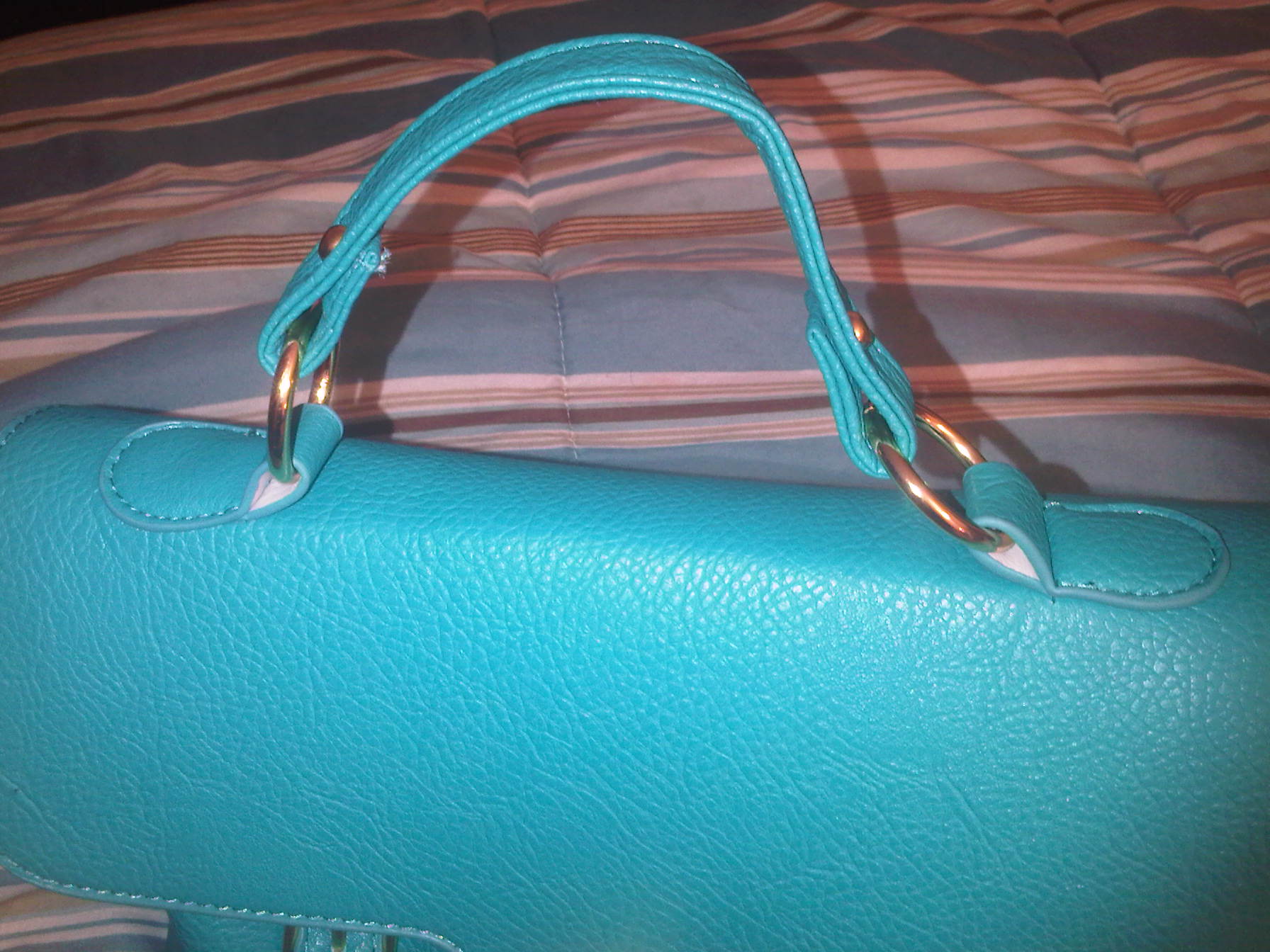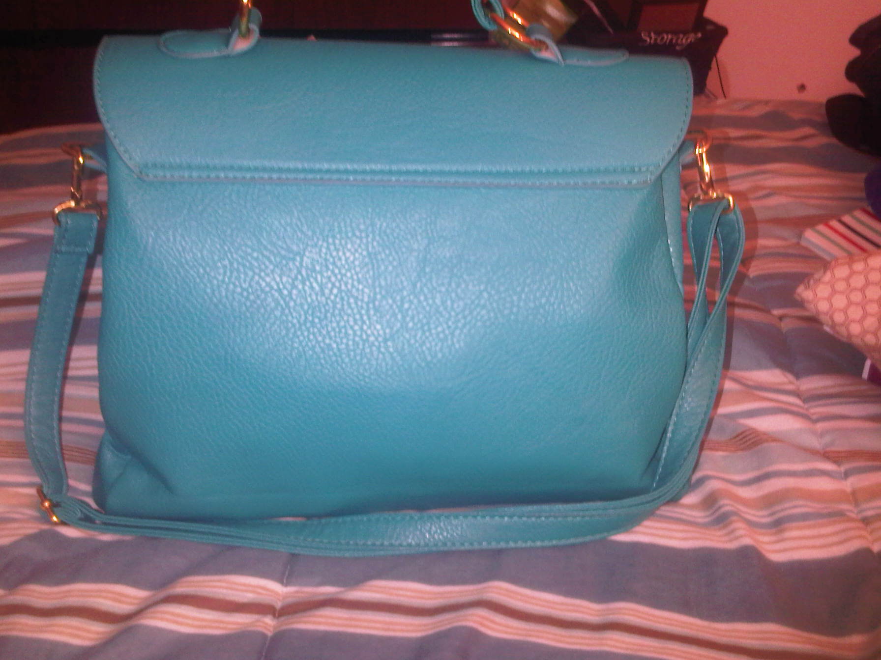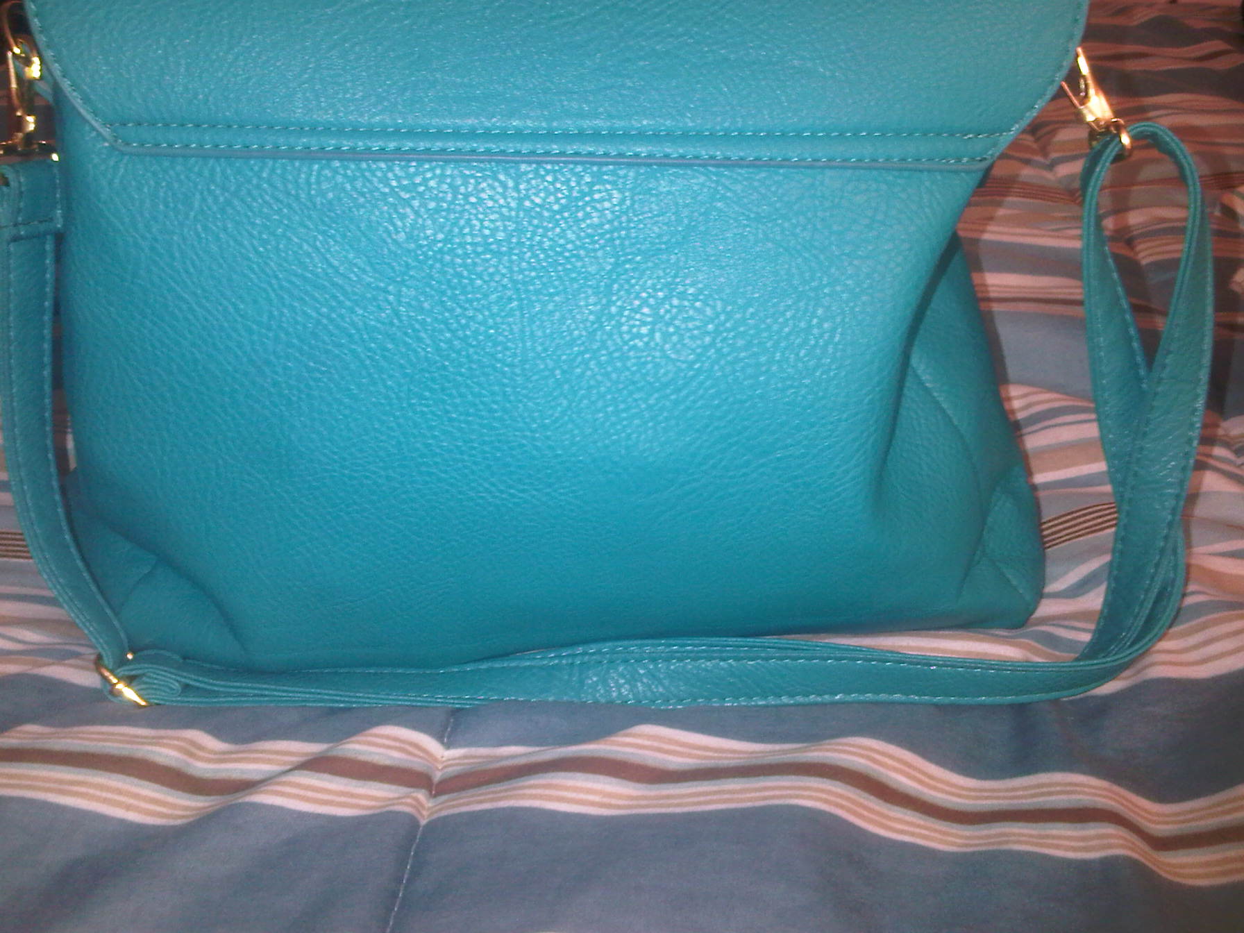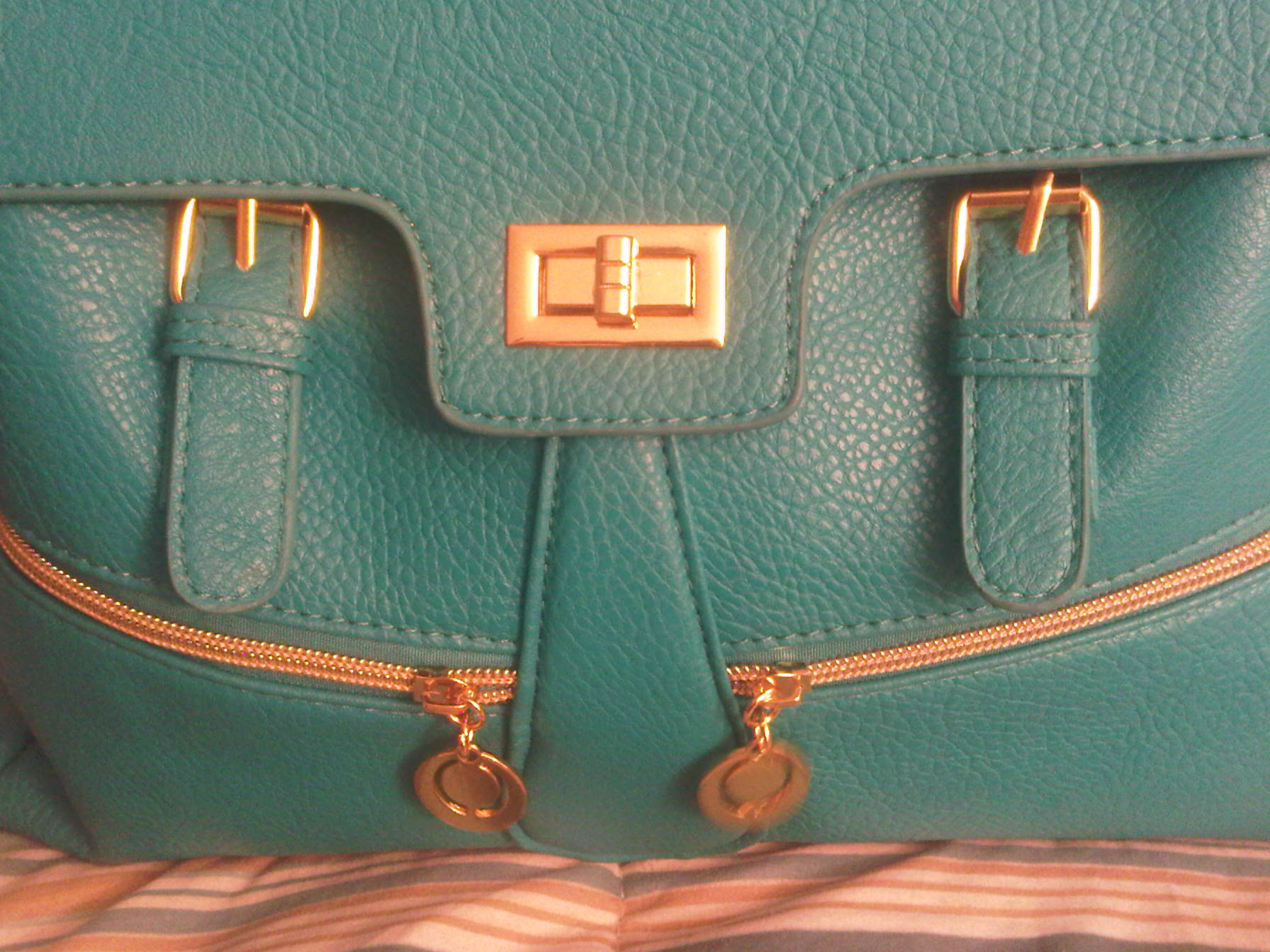 The second purse I purchased…….AAAHHHHHHH!!!!!! Its so pretty!! The color got me while I was scrolling down all the options to buy. Its the perfect pop of color to liven up any outfit! Its like one of the richest teals you have ever seen. Its a satchel type bag, with buckle detail and gold hardware. It features a single handstrap on top and a twist-to-close closure [in addition to a concealed zipper underneath for added privacy and security. It also has two front slanted zipper compartments for added flare. The interior also has a zipper compartment, and this bag does come with a shoulder strap should you choose to wear it that way. I am MUCH more pleased with this purchase. It may be smaller than the other one, which is not usually my preference for an everyday bag, but it still holds a great deal. I also am quite happy with the fact that the purse has a zipper making my items even more secure. The texture and quality of the bag is much better, and did I mention the COLOR??!! Mercy! This purse cost me $ 25.00 including shipping and so far, it is worth every penny!!