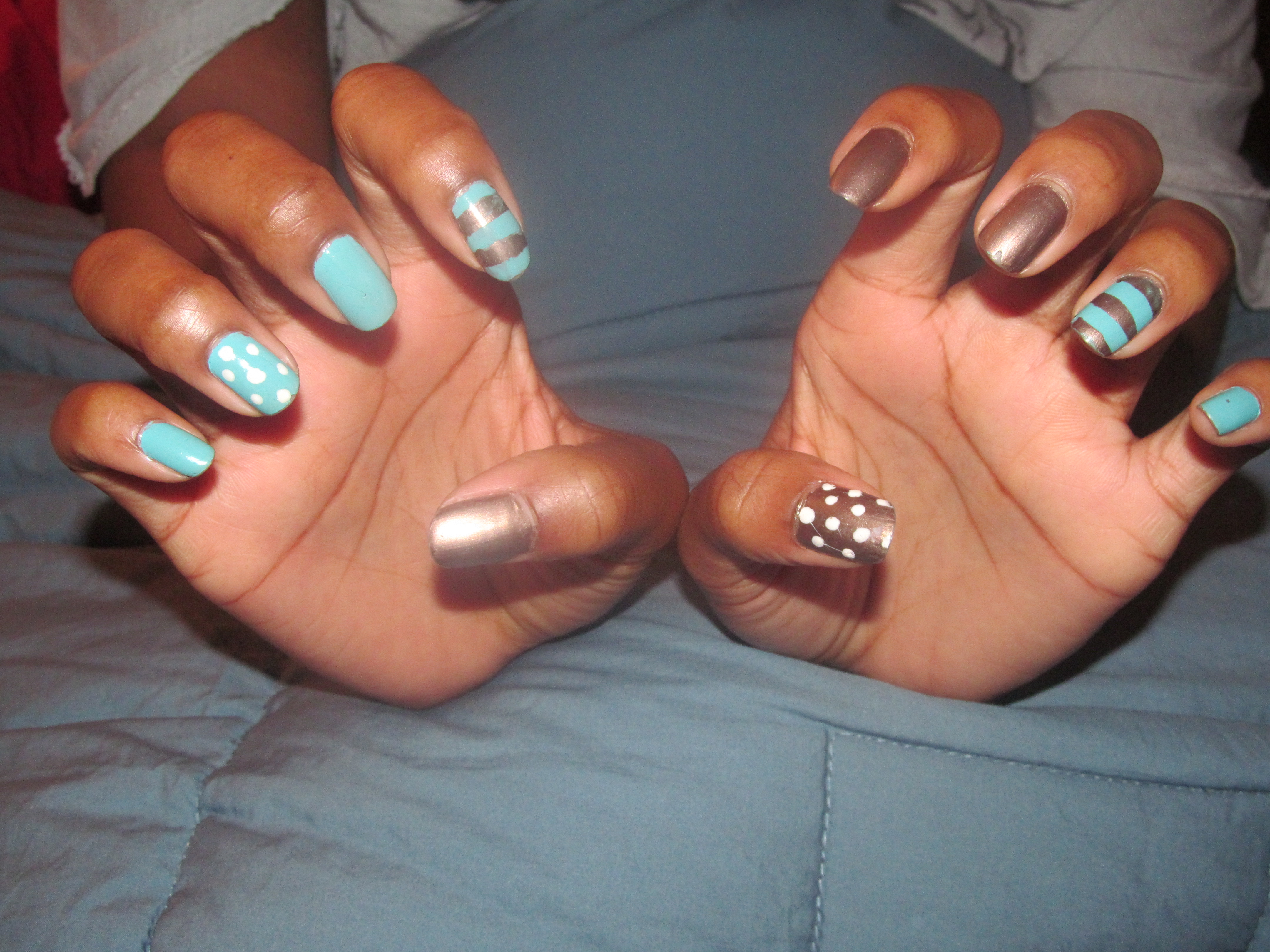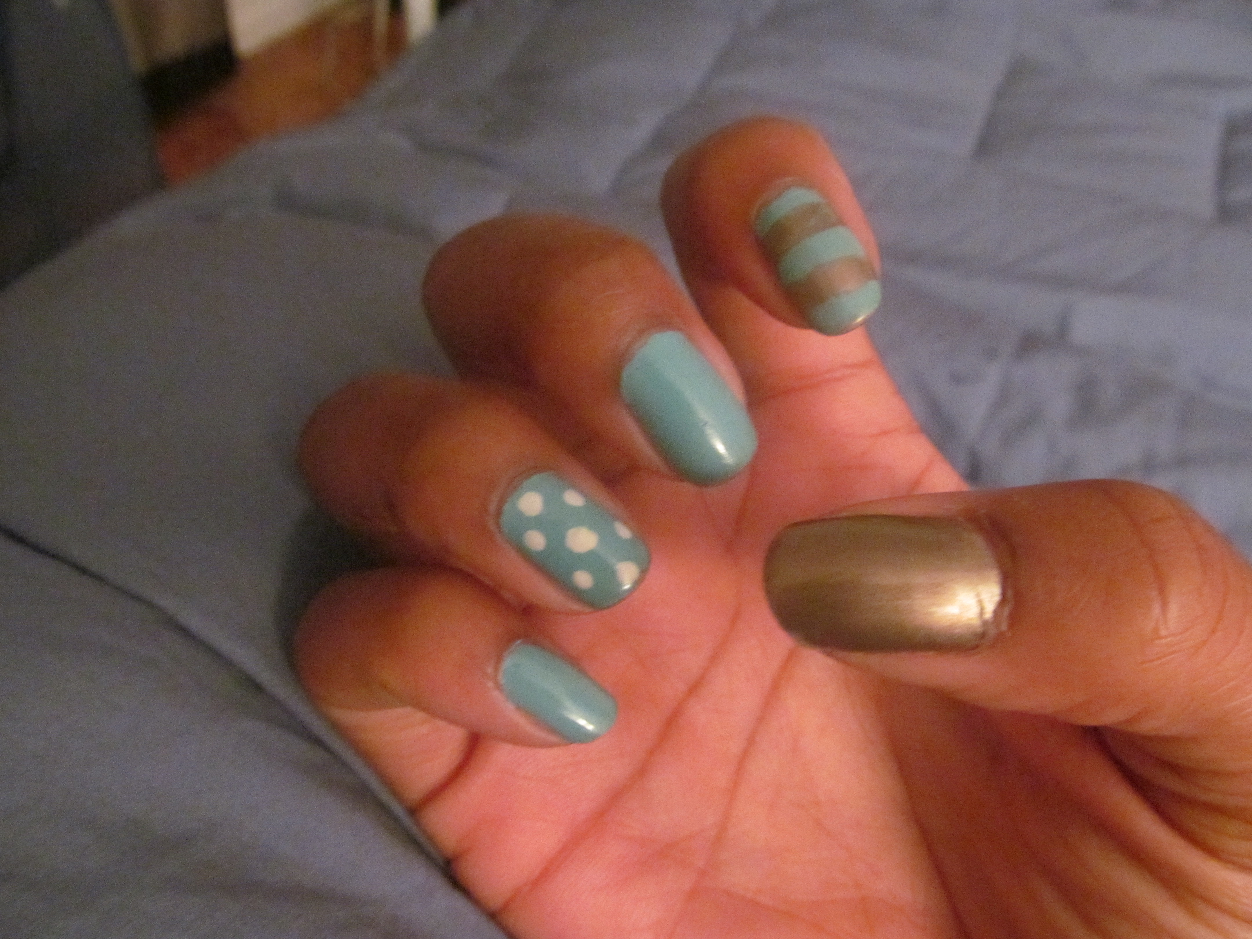 The white polka dots were created using a dotting tool and white nail art polish. The stripes were created using thin strips of regular tape that are removed immediately after polishing.