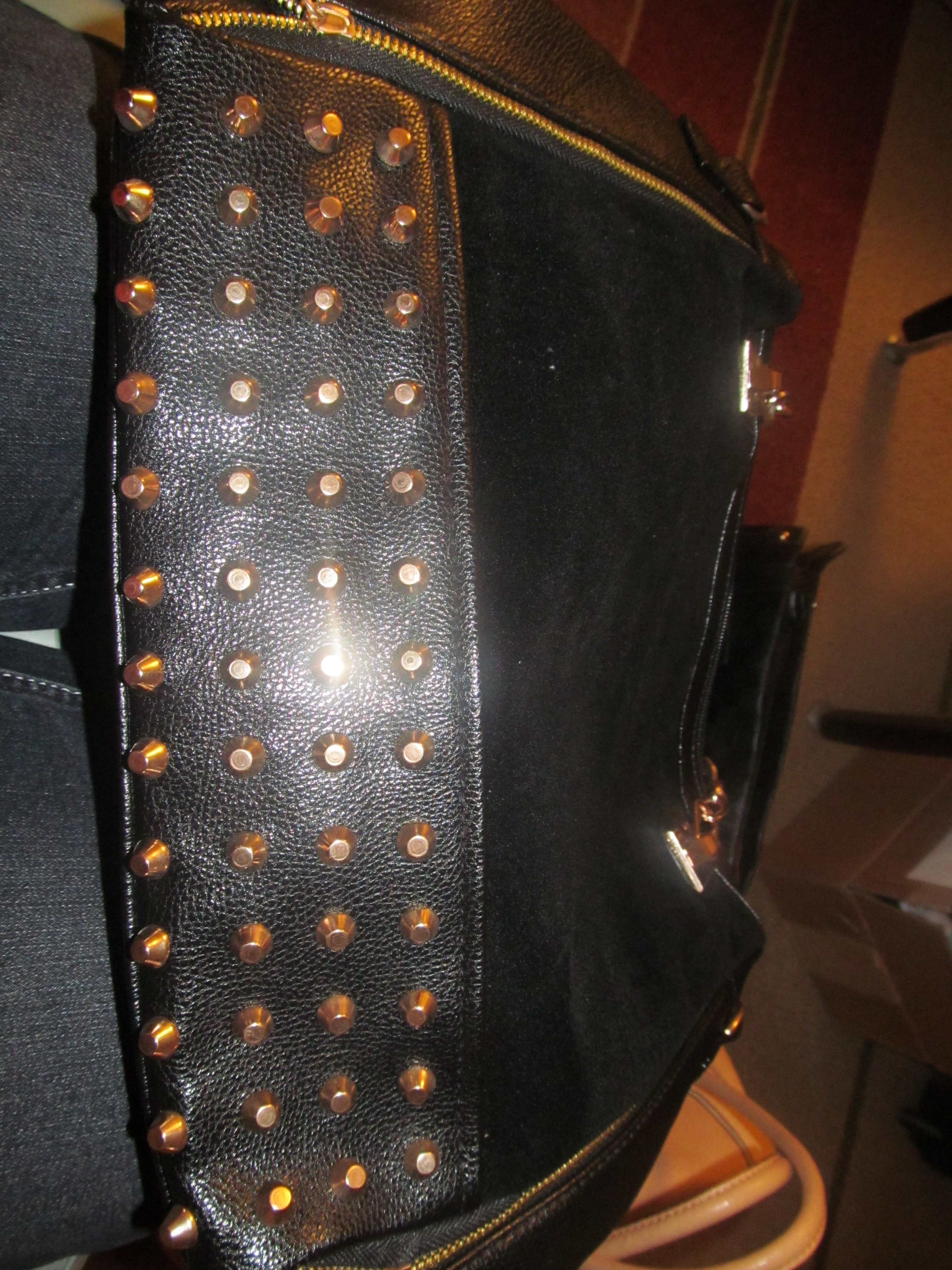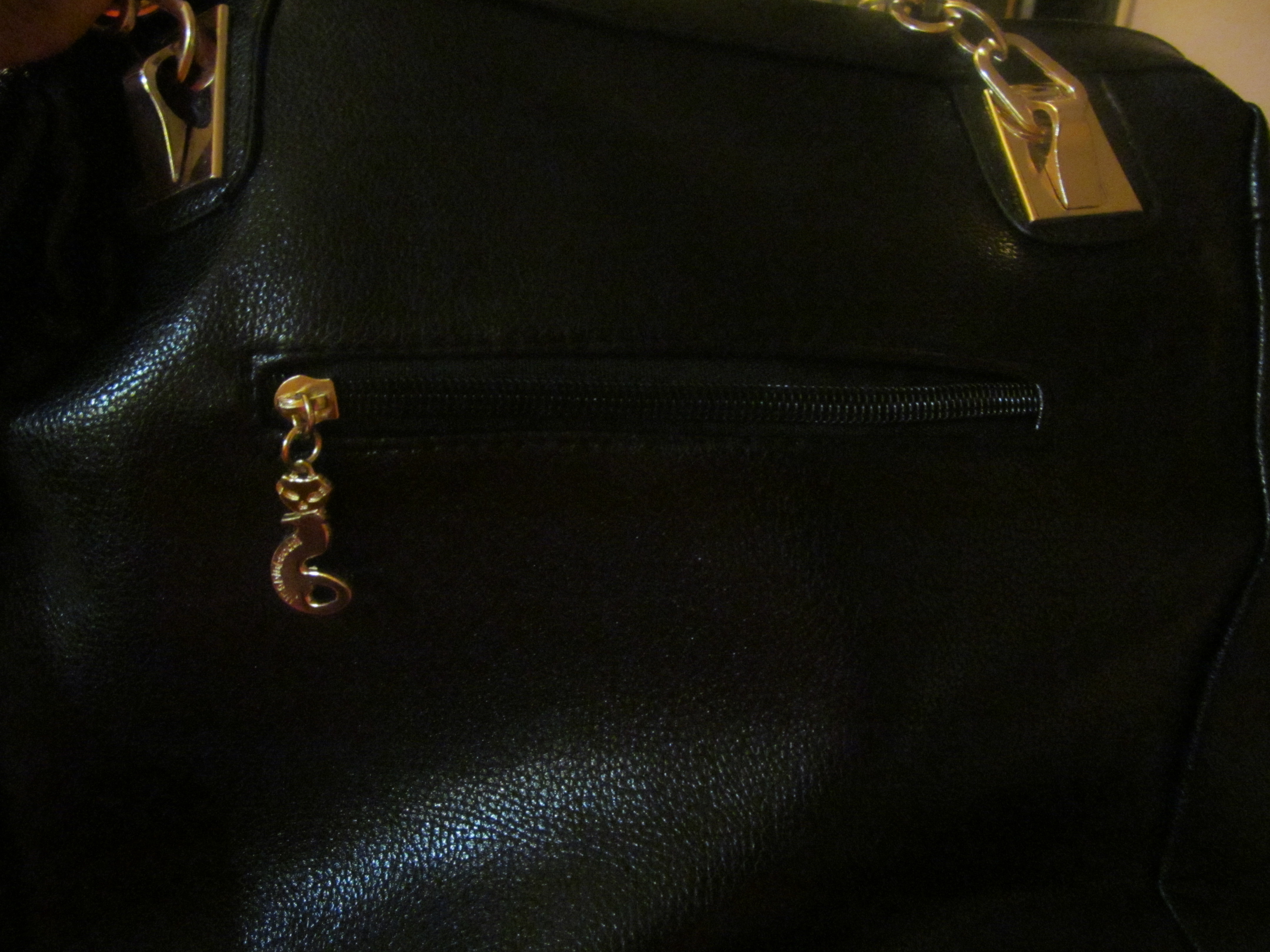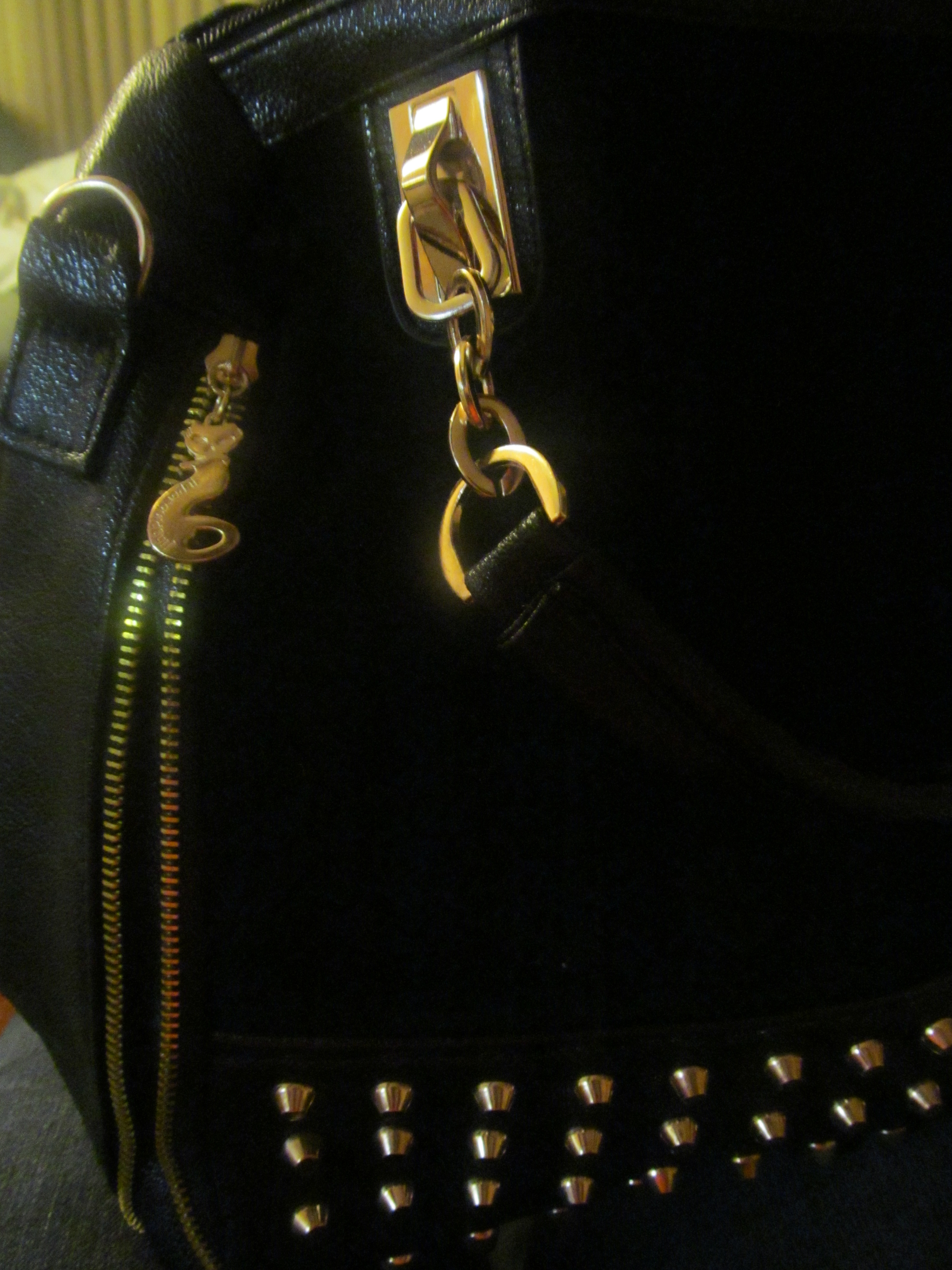 Now on to the details. This bag: AWESOMENESS!! Its edgy yet sophisticated at the same time. One side of the purse features a velvet finish with functioning decorative zippers and studding along the bottom third of the bag, while the other side is faux leather, with an outside zipper pocket [perfect for cellphone and any other small item you may need to find in a hurry]. It has faux leather handstraps as well as a shoulder strap, so you can wear it many different ways, depending on your style. Its certainly big enough to hold everything you need and then some, which is just how I like it! The faux leather and velvet are also very soft and supple, making the purse look alot more expensive than it really is. All the hardware is in a beautiful gold finish, with nice details such as the little animal on all the zippers. The inside features a zipper compartment as well as two open pockets. The purse cost $ 20.99, with free shipping!