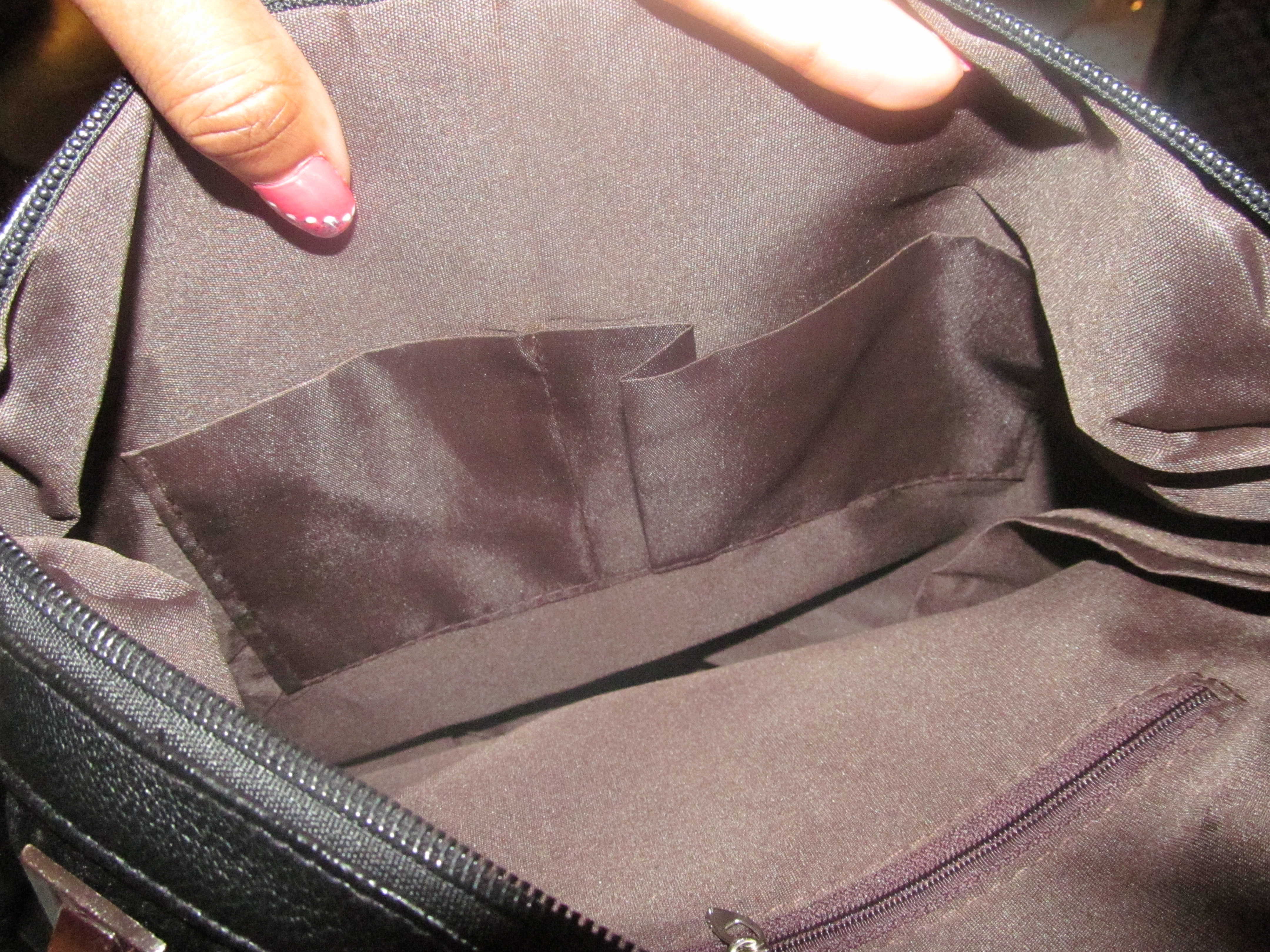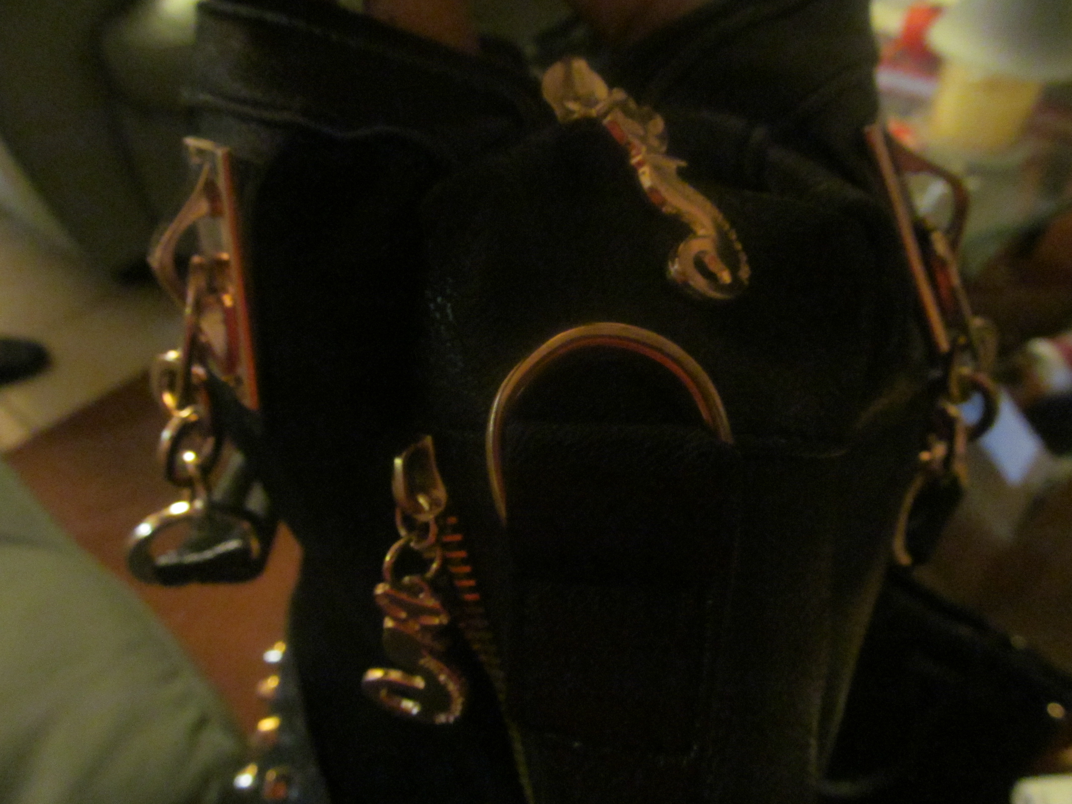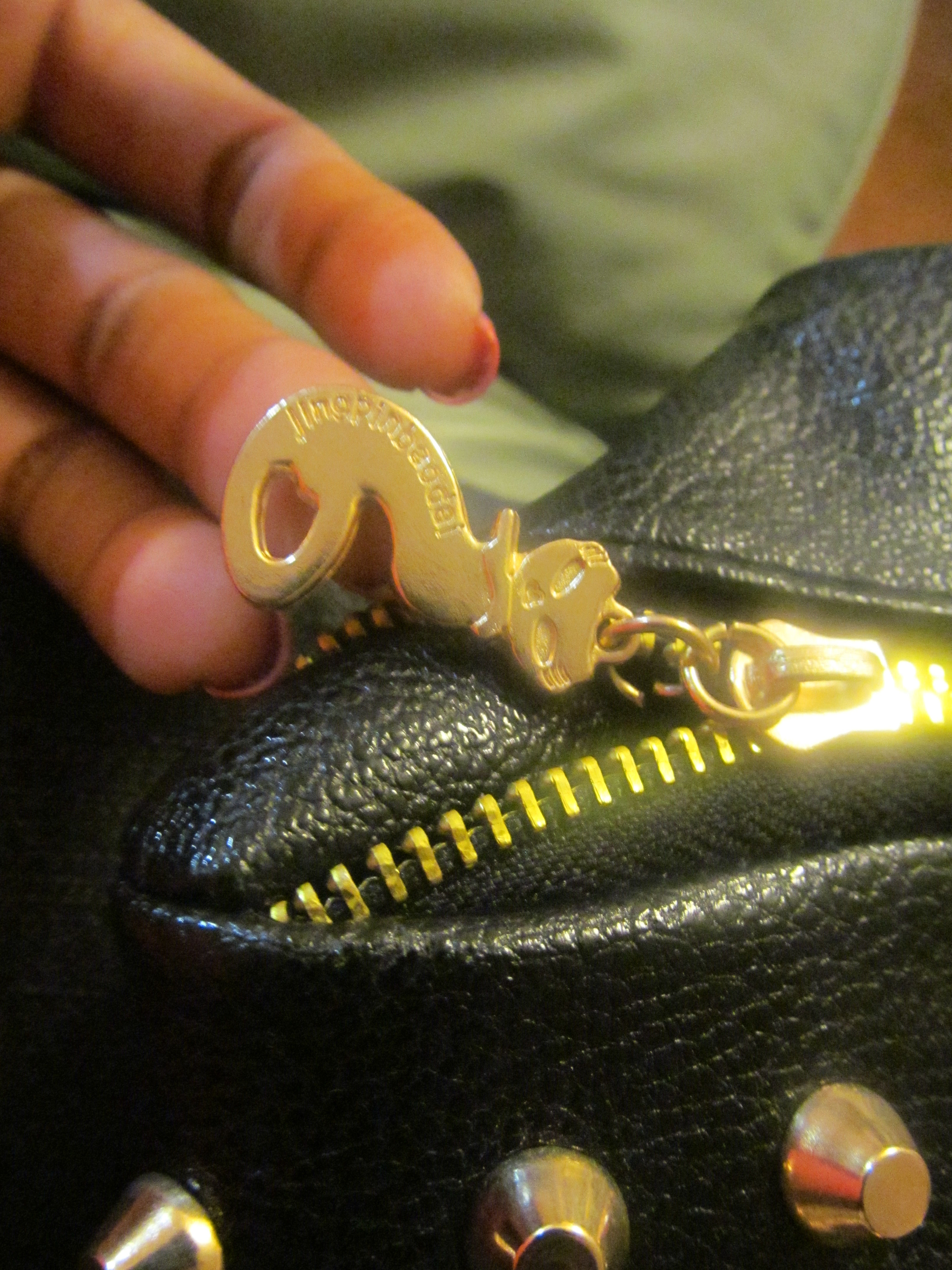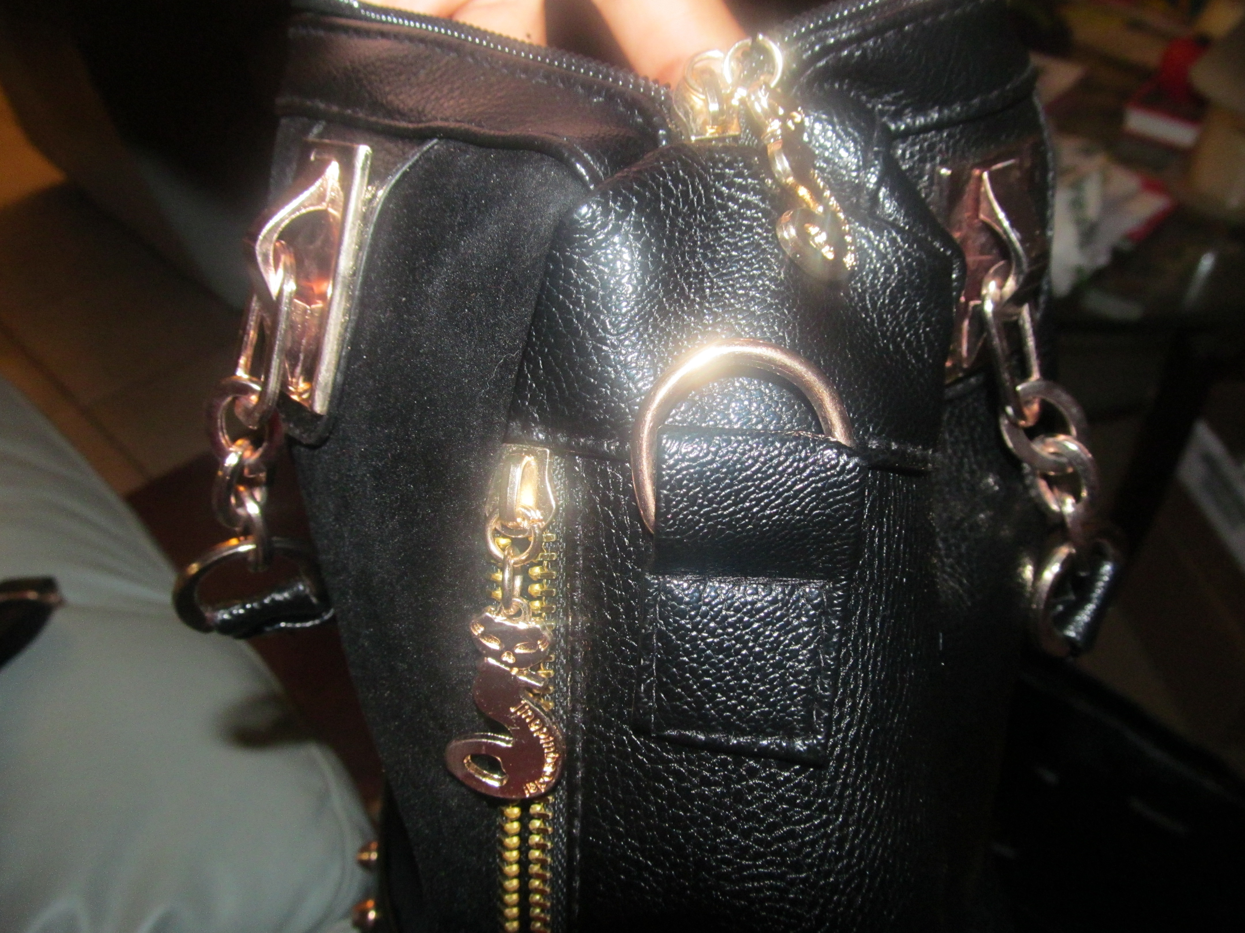 Now on to the details. This bag: AWESOMENESS!! Its edgy yet sophisticated at the same time. One side of the purse features a velvet finish with functioning decorative zippers and studding along the bottom third of the bag, while the other side is faux leather, with an outside zipper pocket [perfect for cellphone and any other small item you may need to find in a hurry]. It has faux leather handstraps as well as a shoulder strap, so you can wear it many different ways, depending on your style. Its certainly big enough to hold everything you need and then some, which is just how I like it! The faux leather and velvet are also very soft and supple, making the purse look alot more expensive than it really is. All the hardware is in a beautiful gold finish, with nice details such as the little animal on all the zippers. The inside features a zipper compartment as well as two open pockets. The purse cost $ 20.99, with free shipping!