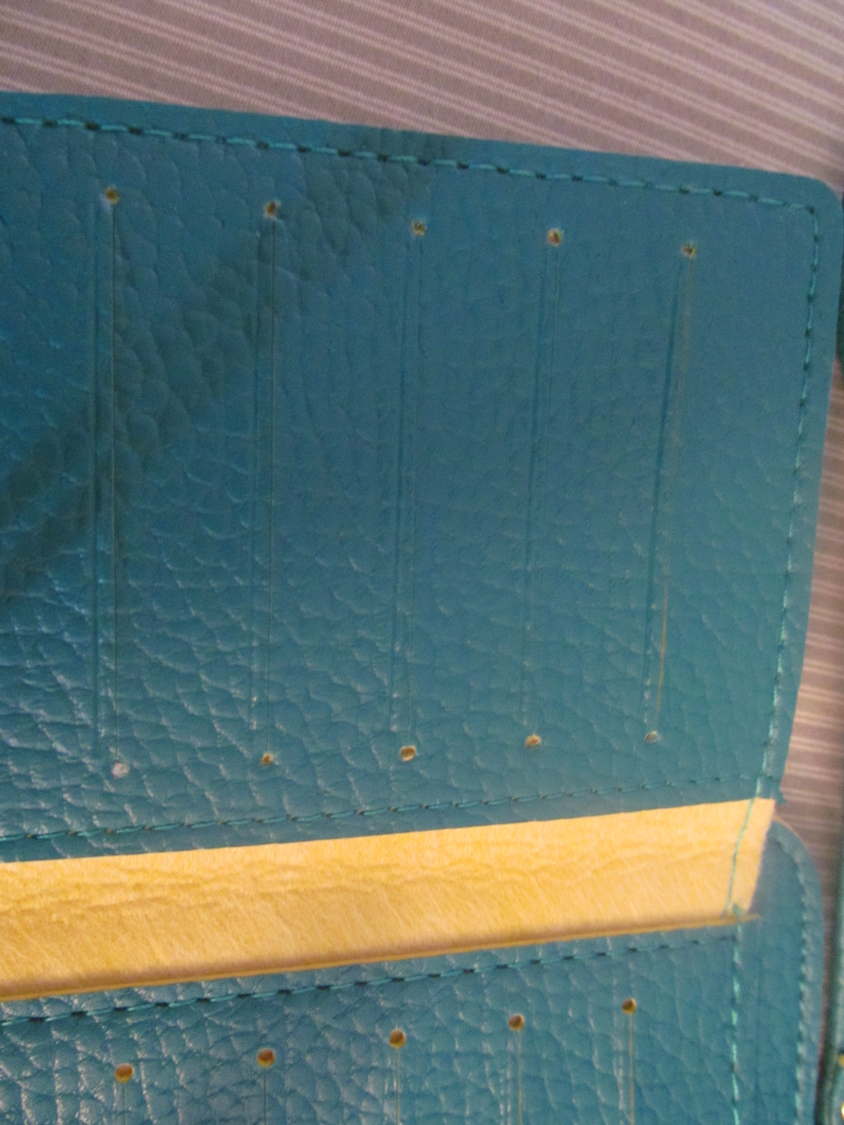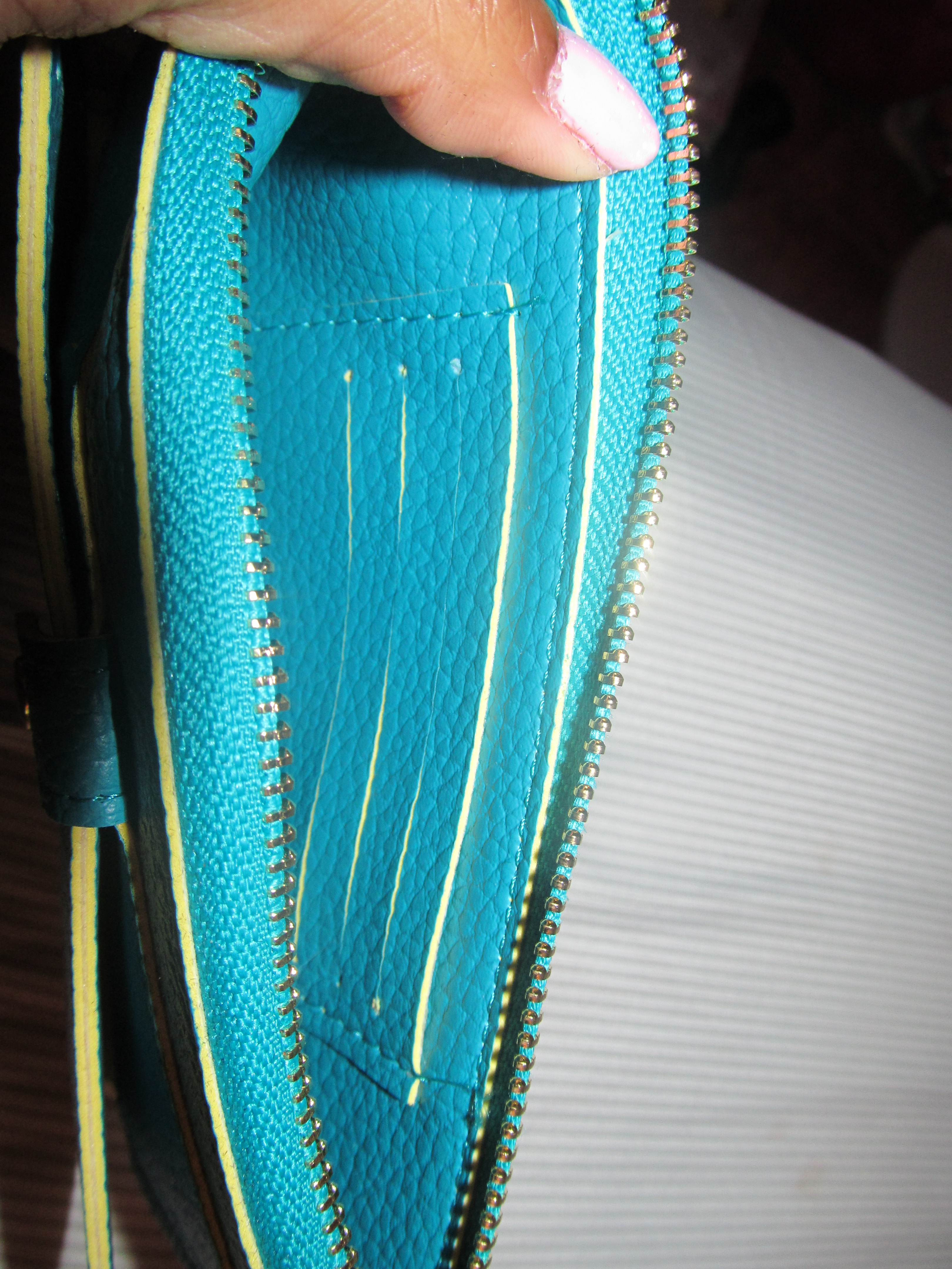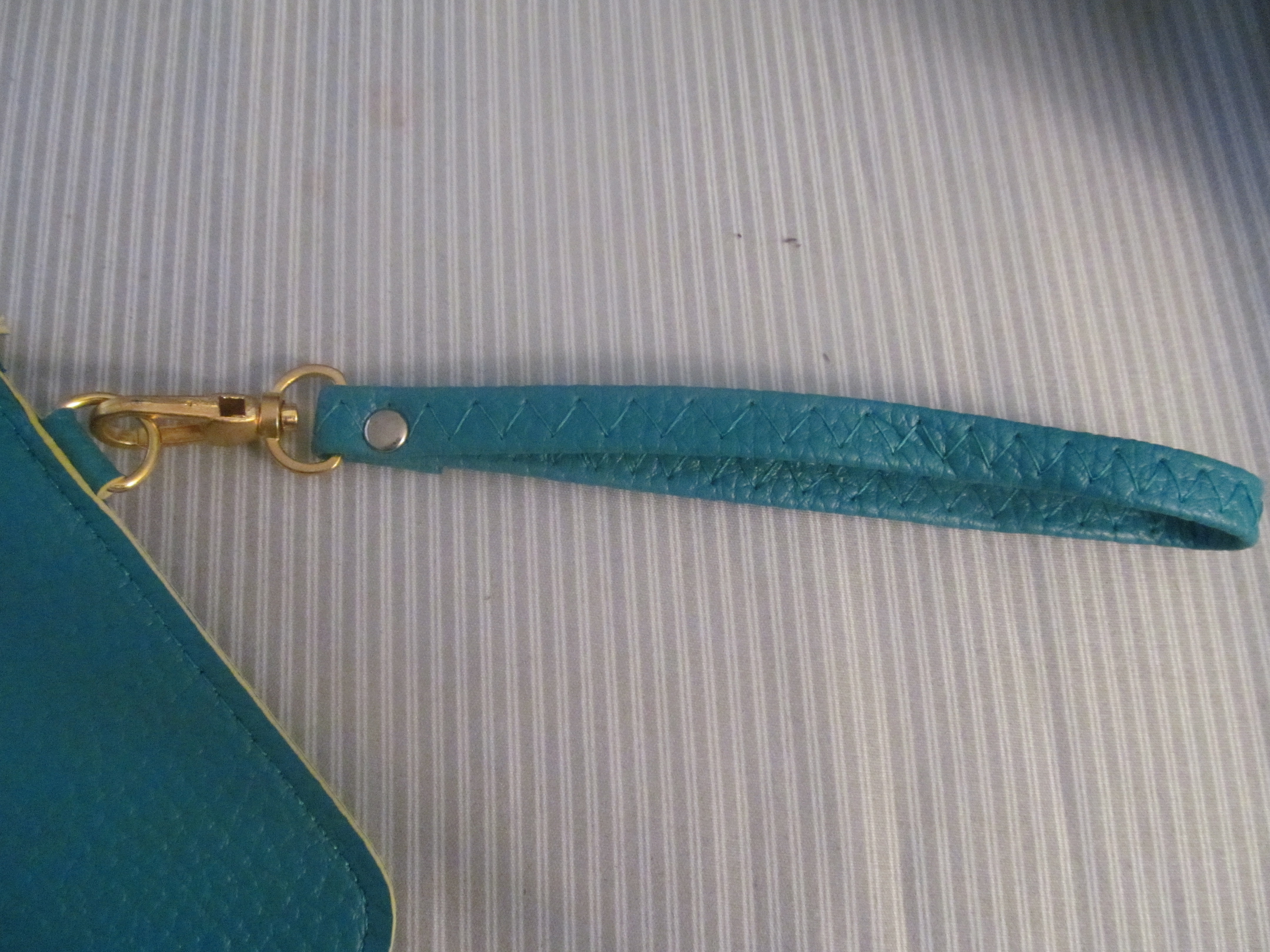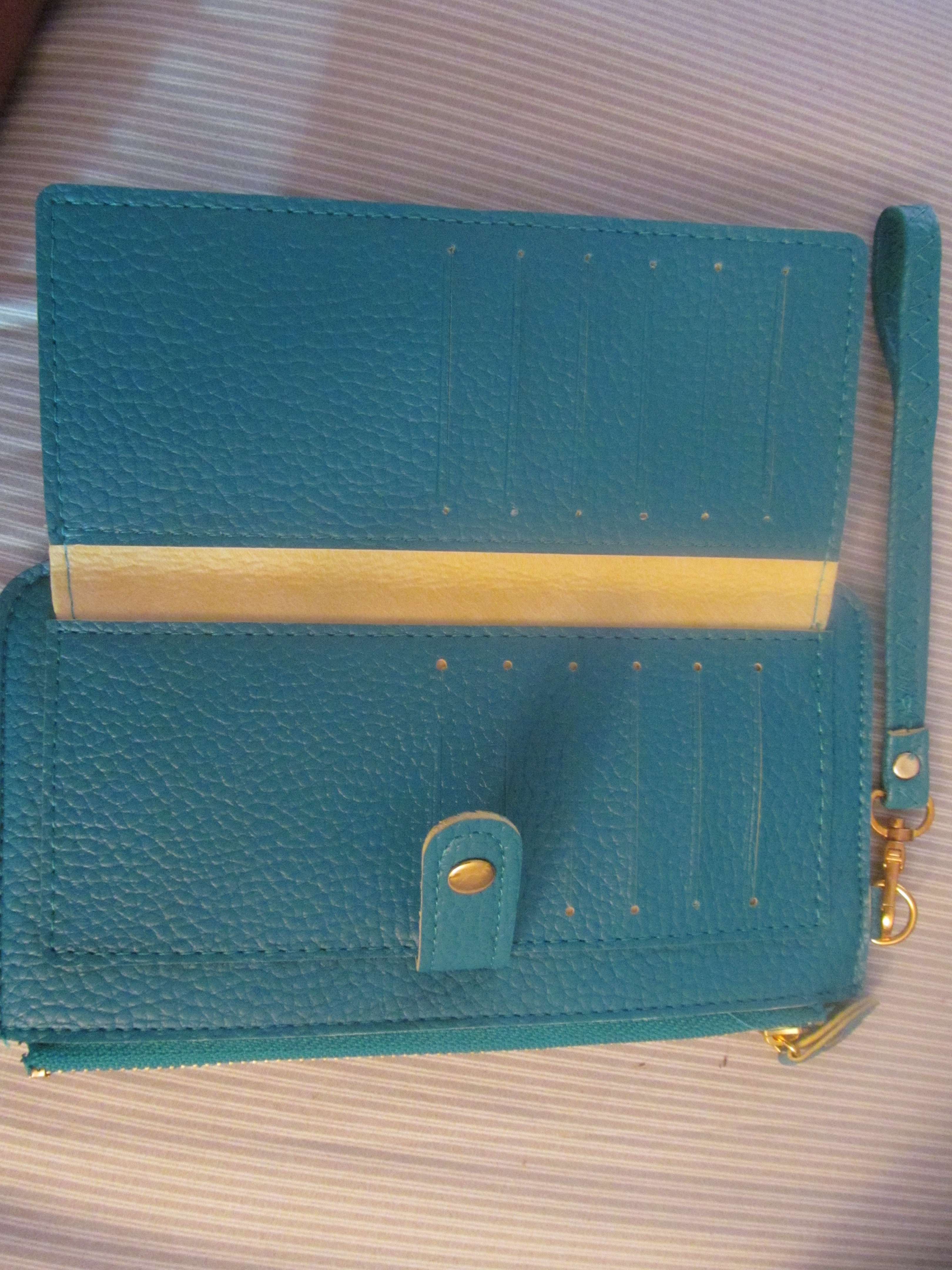 As I mentioned before this wallet is a beautiful turquoise shade, with a bright yellow contrast piping [can you say spring?!]. It has a fold out ‘wallet’ section with a snap closure, as well as a zippered section at the top of the bag. There are many card slots in both the snap and zipper sections, but the snap section also has a pocket for paper money, and the zippered section, as I mentioned before, can hold a few small items. The wrist strap that also comes with the wallet for easy carrying, is detachable in the case that you want to use it mainly as a wallet and not so much a wristlet. I don’t remember the exact price again but I’m pretty sure it was around $5- $6 with free shipping.