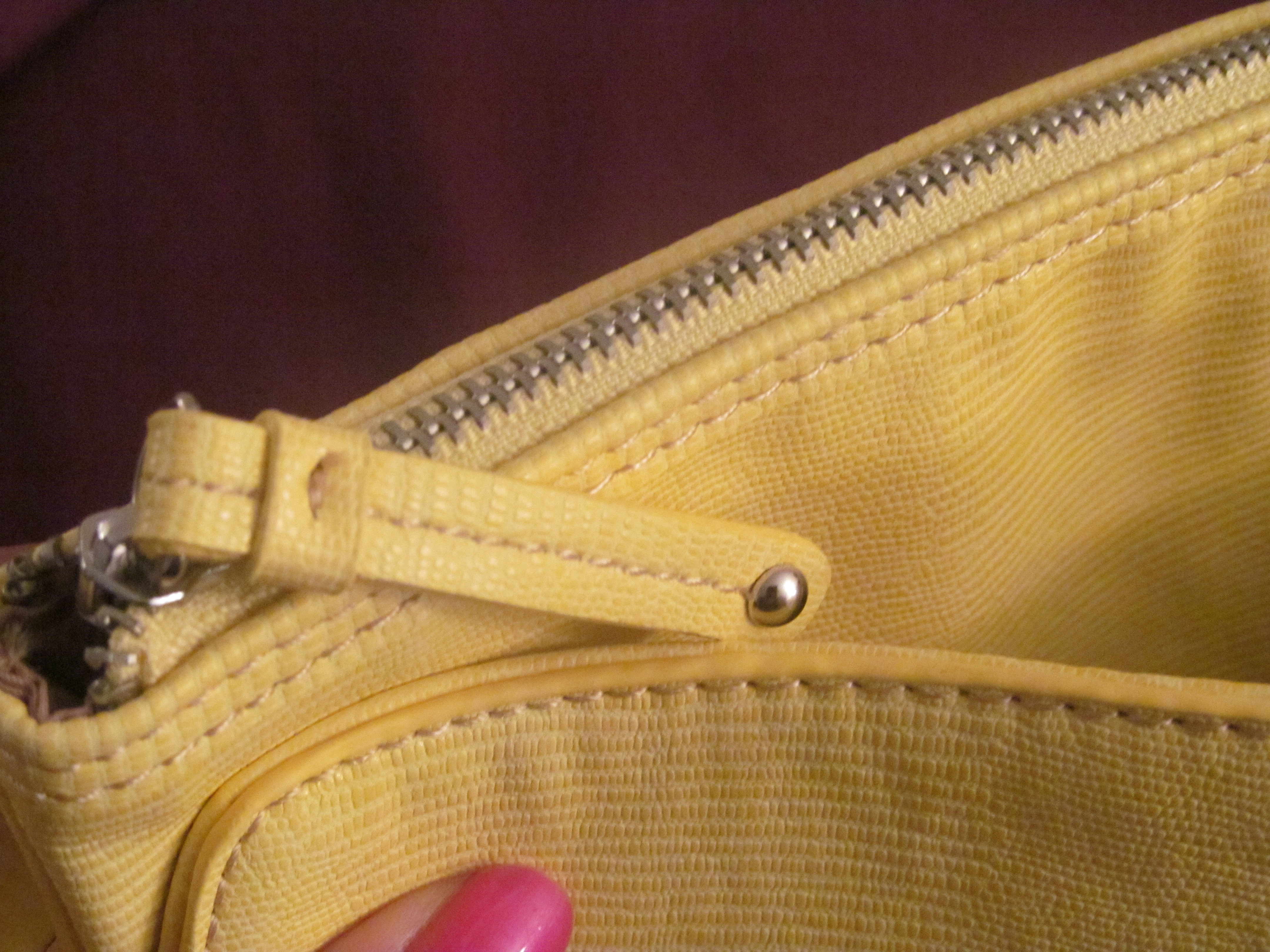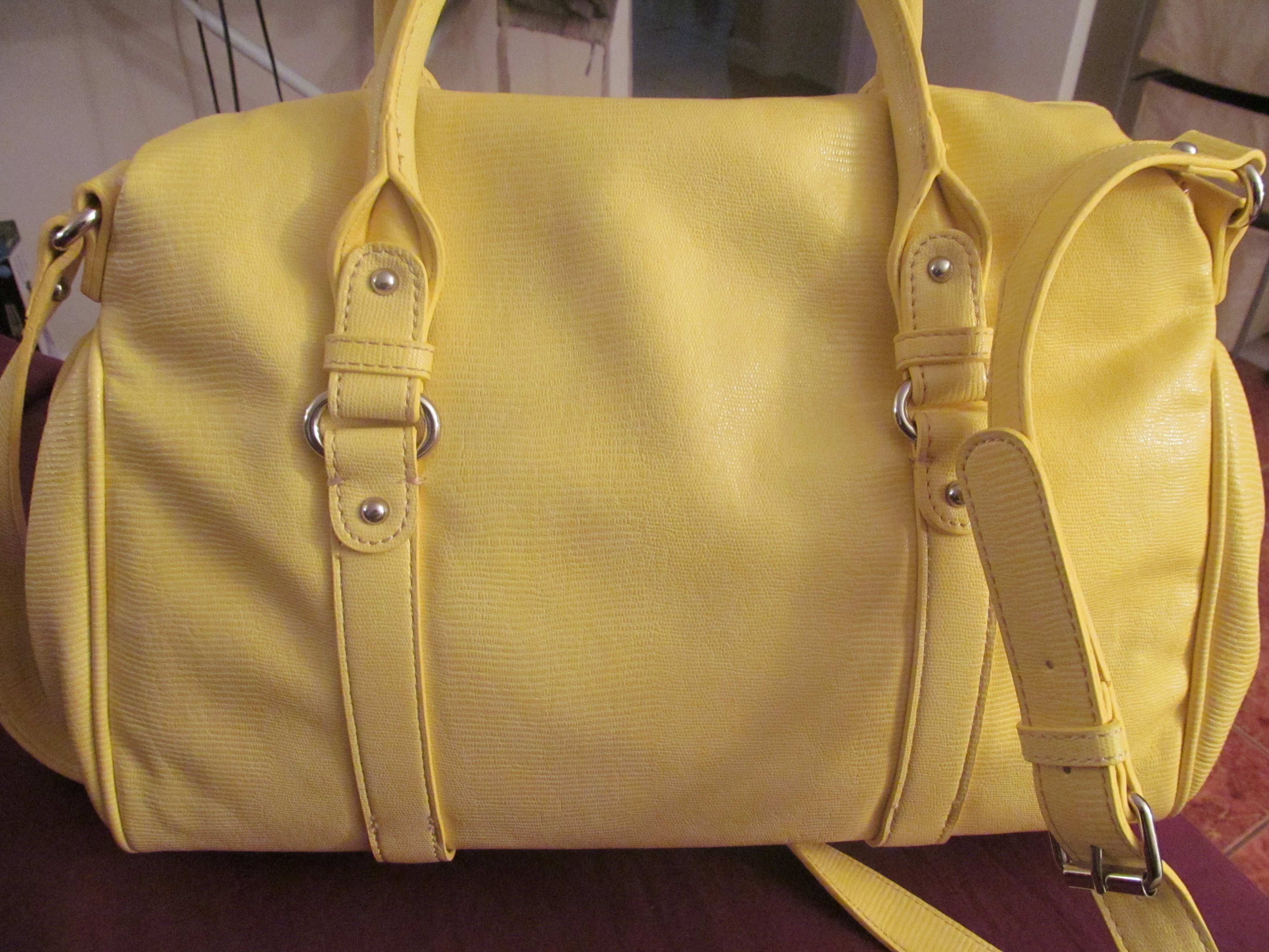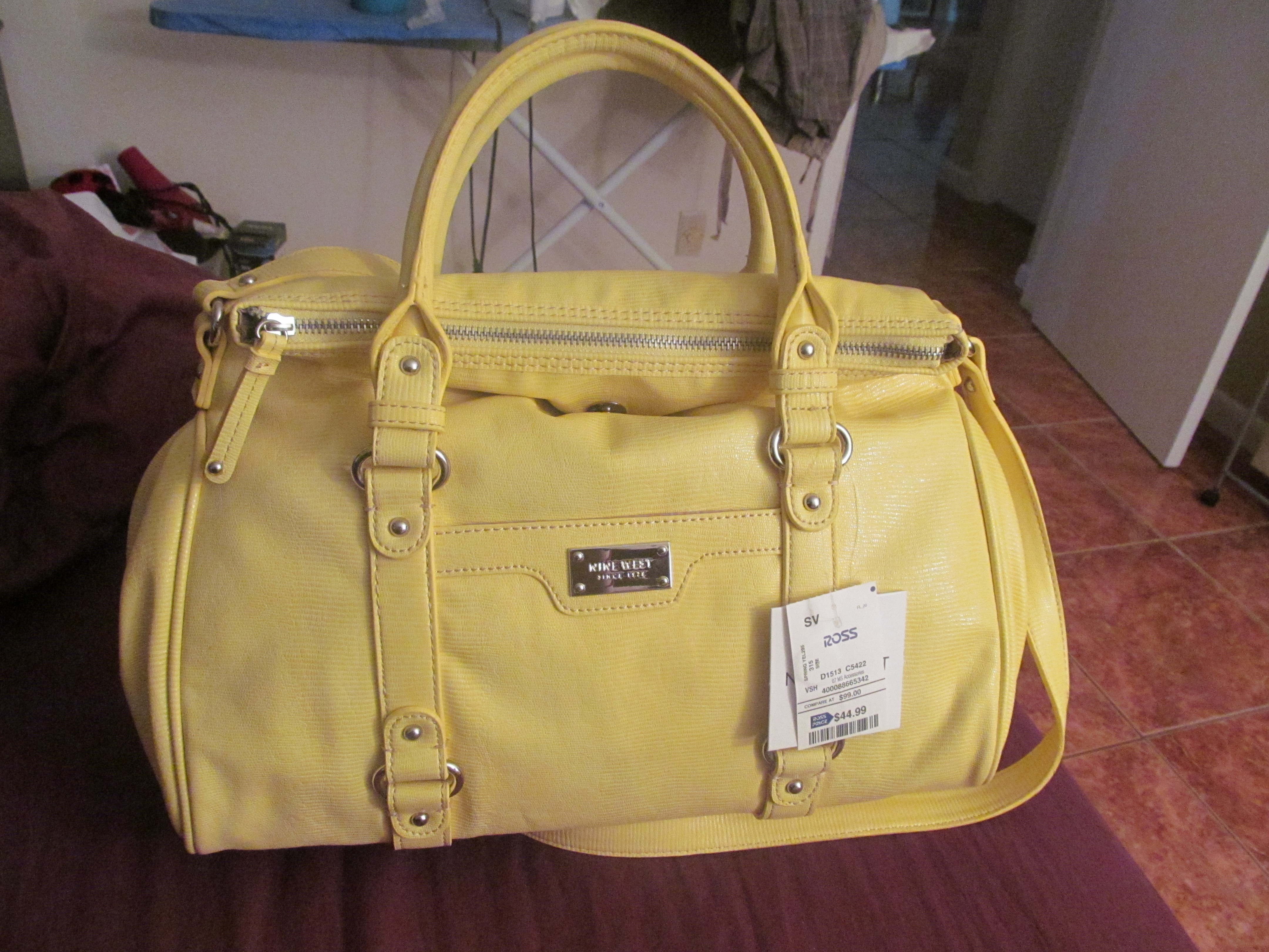 This posts feature is a beautiful mellow yellow satchel. Its from Nine West and I got it at Ross. I especially love the color of this purse. It just screams happy, sunny spring afternoon. I got it at Ross, some time ago, for $ 44.99. It can hold so much, even though it looks like only a medium sized purse [especially compared to some of the purses I own].