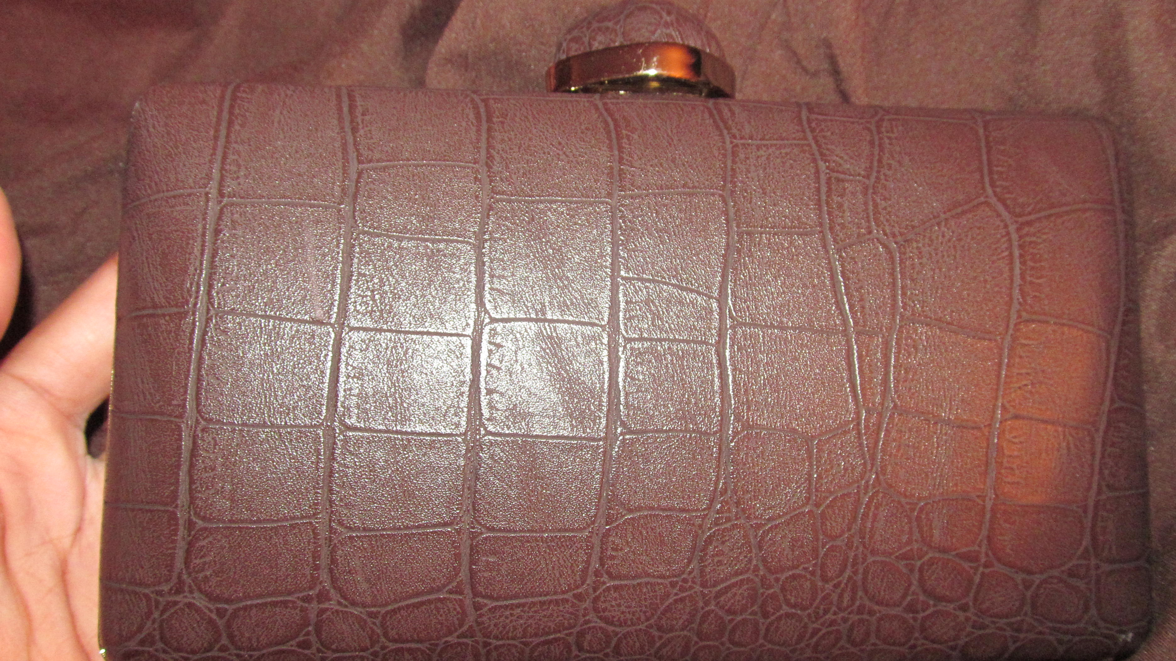This post features a beautiful, chocolate brown clutch that I bought at Marshalls for $ 19.99 [originally $ 35]. It’s a hard-body clutch with a top oddly-shaped clasp [not quite a diamond or square, but also not circular]. One side of the purse is faux leather animal print, and the other side of it is a woven fabric. The two different textures on the purse not only look cool, but also give this clutch so much character [especially for something so small]. The inside of the purse is lined with a silky black and white striped fabric, with a metal name plate featuring the brand name ‘Miztique’.