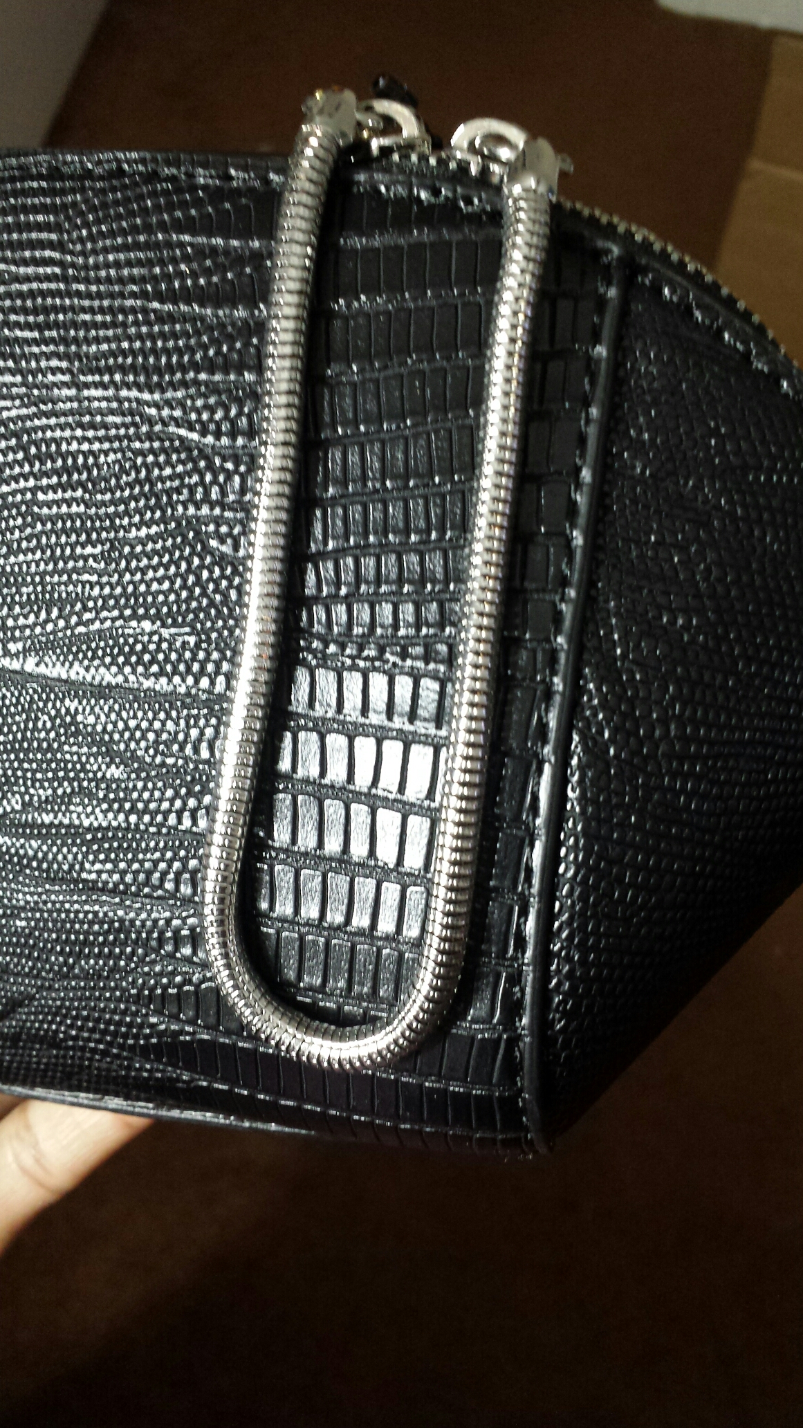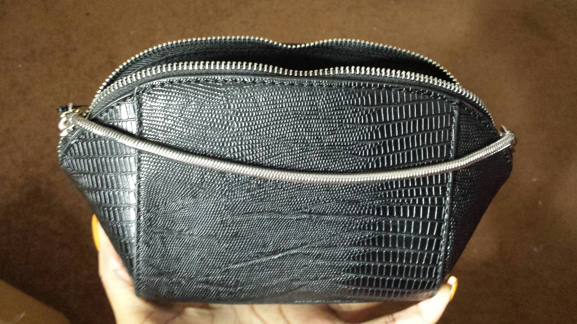 It’s a black faux leather handbag with a silver wriststrap that also doubles as a double zip pull. It has inside pockets as well as an interior zipper. It holds quite a bit…my phone, snacks, candy, make up supplies and my keys, despite its modest size. It also comes in a grey shade, but I fell in love with the black. It even has two stands to make sure your purse doesn’t touch the ground