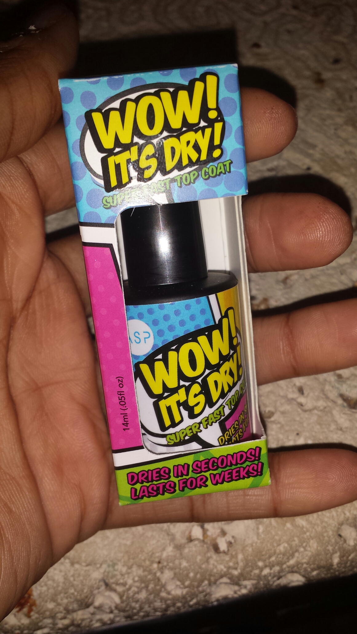 It’s in an interesting bottle. It’s a black bottle, and has a sort of pop art design on it. Now that I’ve tried it, I have a few thoughts. Firstly, it’s not as offensive a smell as nail polish usually is, so that’s a plus. Secondly, it does have a pretty nice sheen, when it dries. Thirdly, it does dry relatively quickly. All be it, not as fast as my Seche Vite, but still pretty good. I haven’t yet gotten to properly analyze how long it will keep my nails from chipping, since I just put it on, but I will update you.