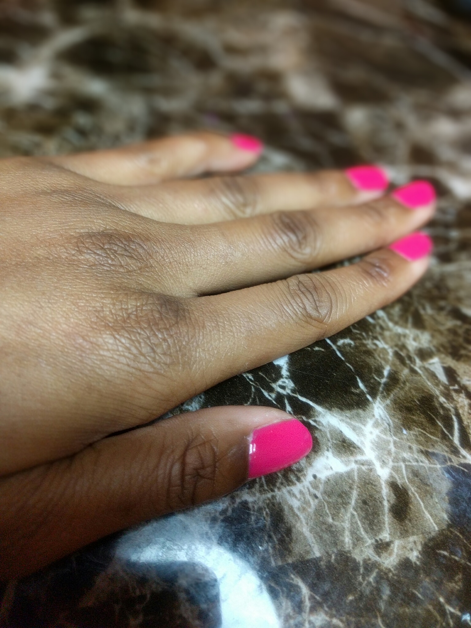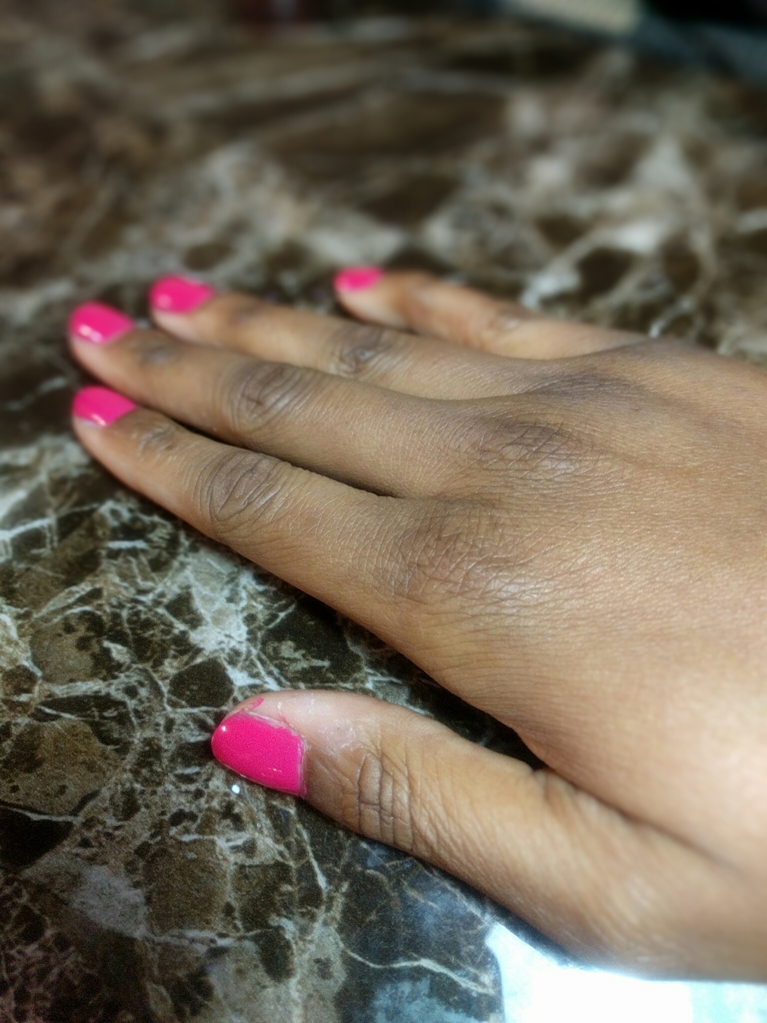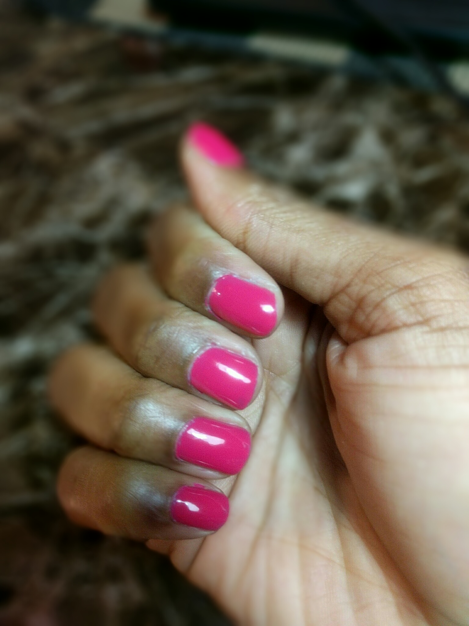 This manicure is a beautiful fuchsia color I picked up while on a recent trip to Walmart. I found this and a couple other colors at the check out display. It has a pretty good formula, but still a two coater in my opinion.  It has also had pretty decent staying power.  It was $1.97, so also a pretty good deal for a very nice polish.