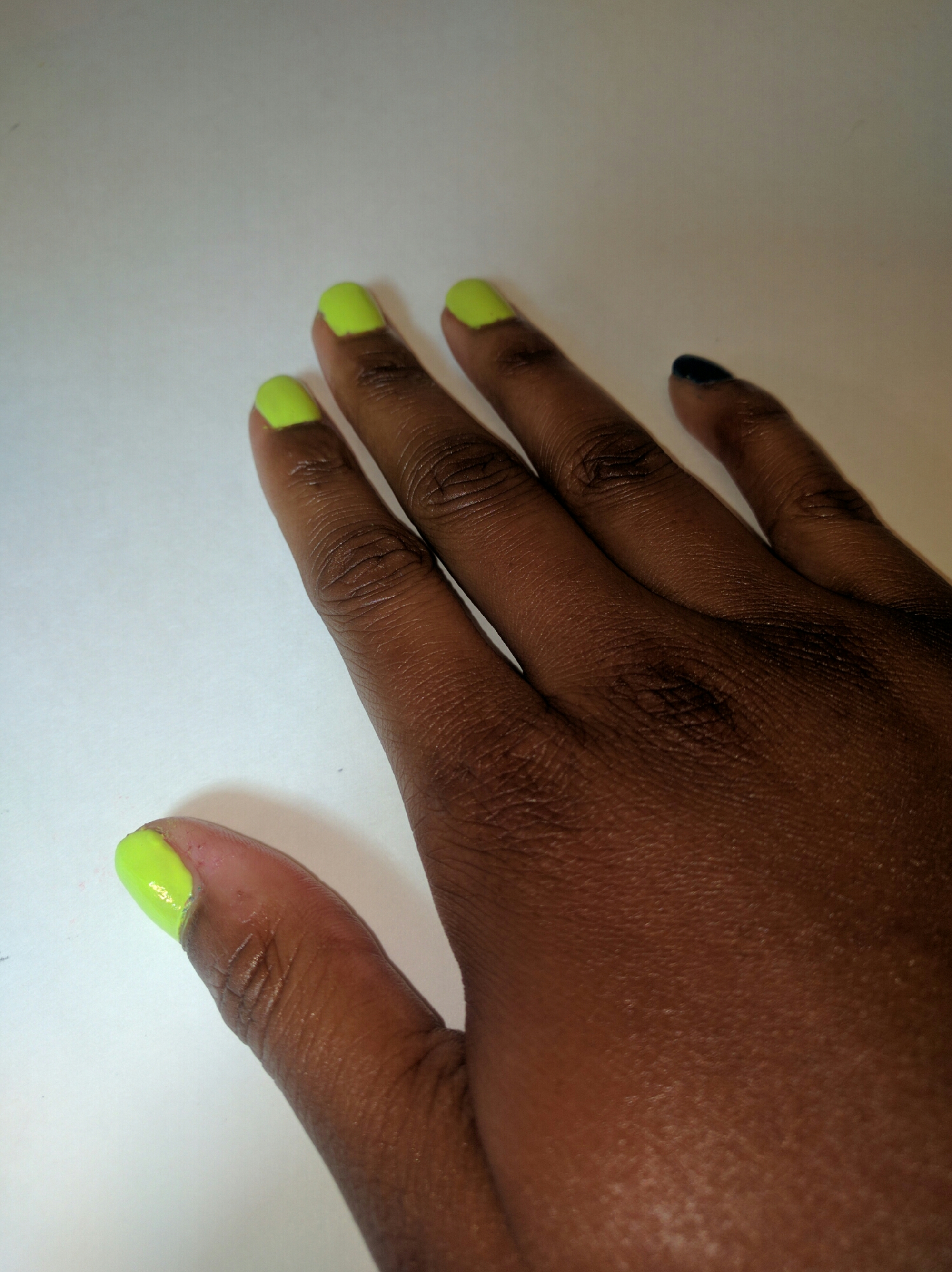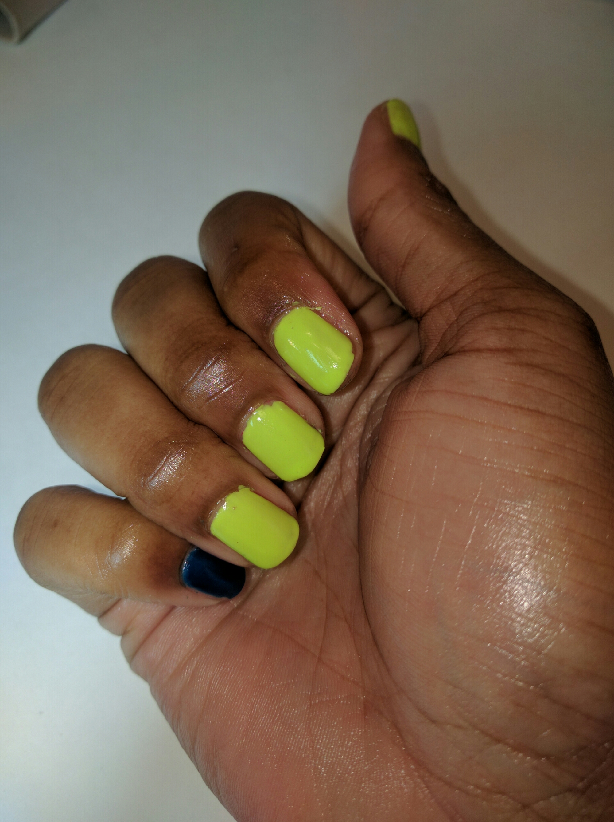 The neon, I will say though, is a true neon. What I mean is, you don’t need a white base with this polish. Two coats of this is completely opaque. I found it at a beauty corner store for around $5. They had other more pastel colors, but this one caught my eye. I’ve been on the hunt for a ‘true neon’ for a while, and I am quite pleased to have found one.This neon polish is from a brand called ‘RK’ by Kiss HD in the color ‘Lime Mojito’. The one negative I have to say about this polish, though, is the fact that it does get thick fairly quickly. I’ve used about three or four times, and I may have to use a thinner in it soon, so it doesn’t get goopy.