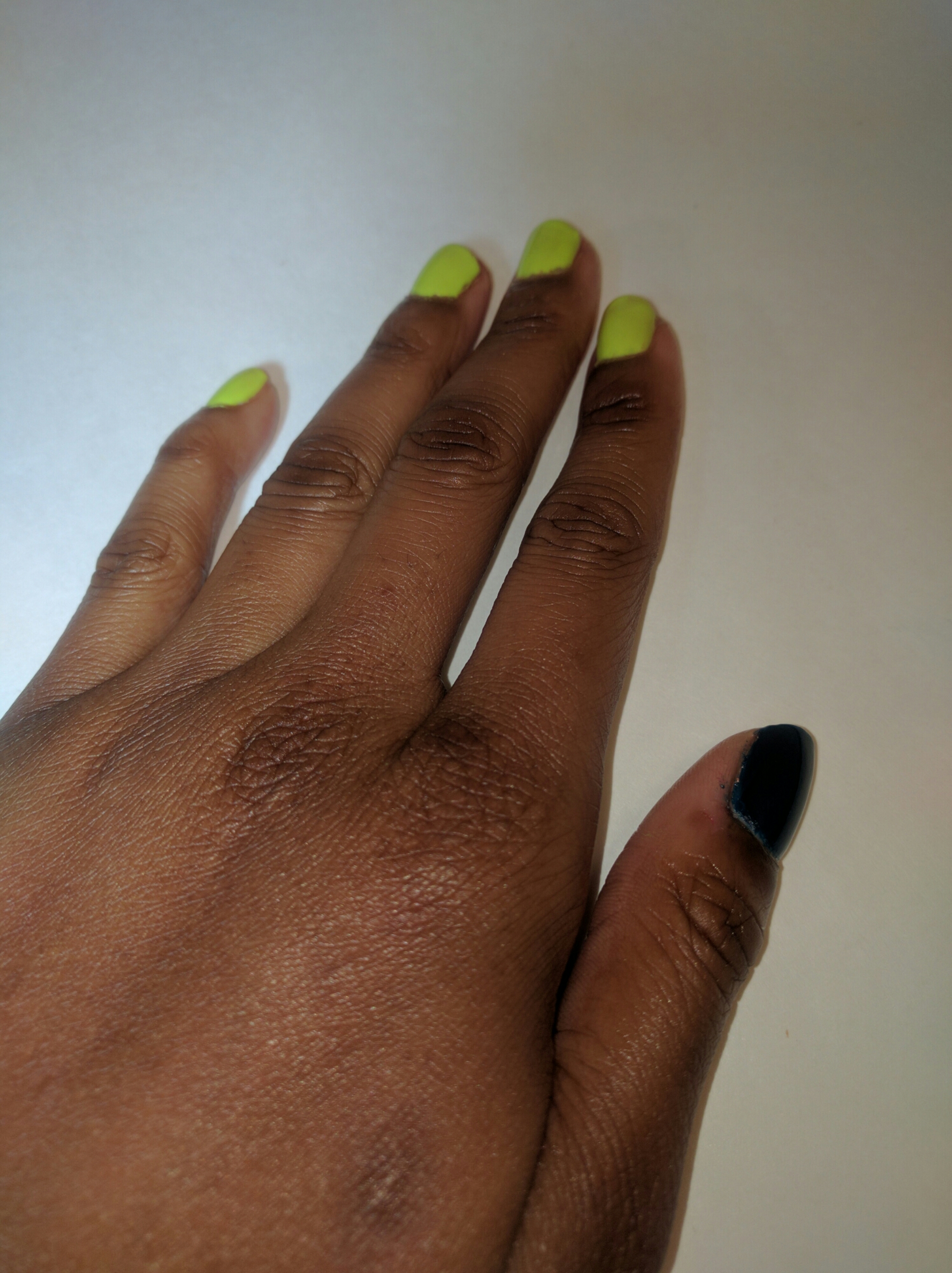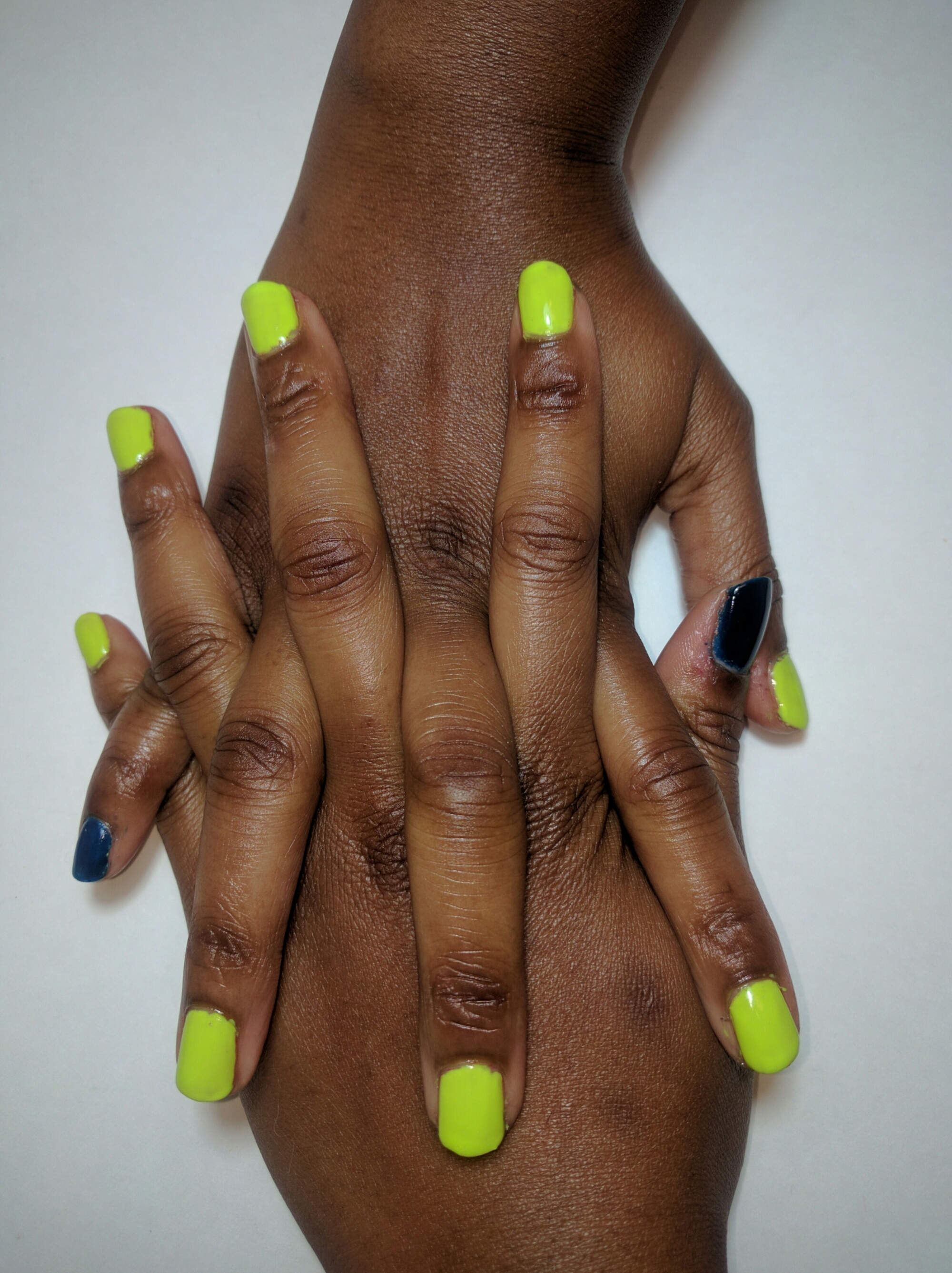 Today’s manicure is a neon and navy duo. I picked it simply because the colors were on my dresser when I was ready to do my nails. Simple as that. Wish I had some more ingenious reason as to why I chose these colors. But, oh well.