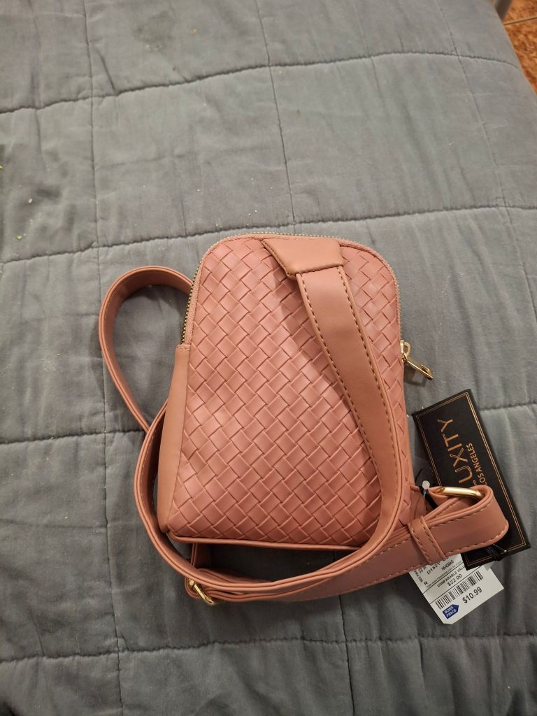 Today’s post features a mini crossbody faux leather backpack with a faux woven fabric on the front and back. On the front is a gold plated emblem (it feels like plastic, which is good so it doesn’t add extra weight to the bag.